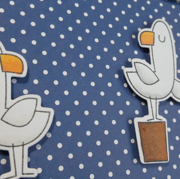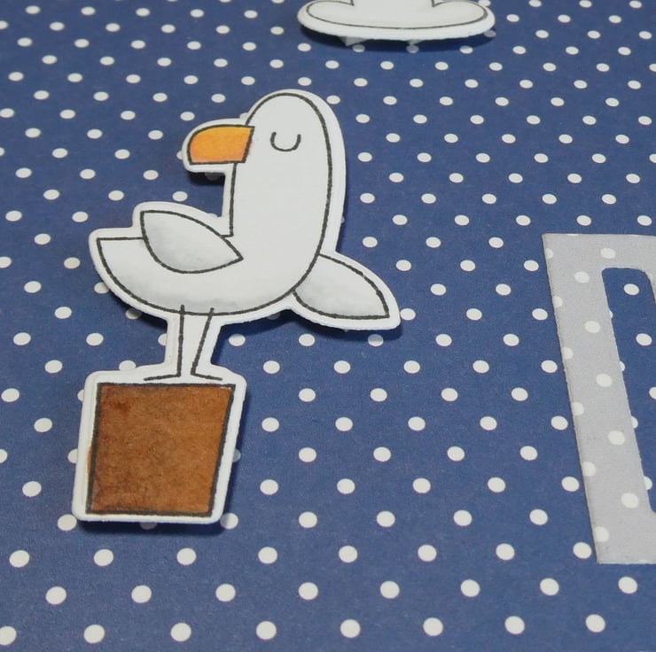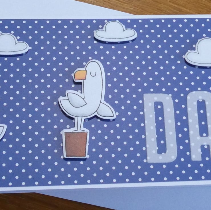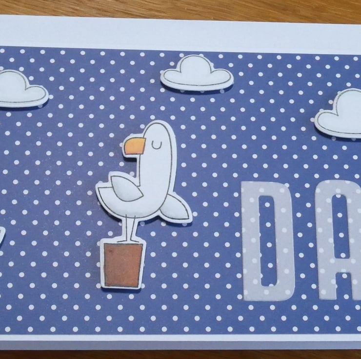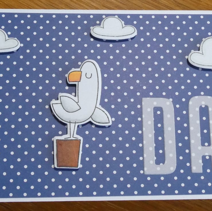 The gulls and clouds have been stamped onto card, coloured and die cut, then mounted using foam pads to lift them from the background. Individual letters forming the word Dad have been cut from pale blue and white polka dot card and glued flat to the background.