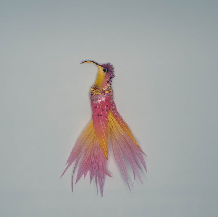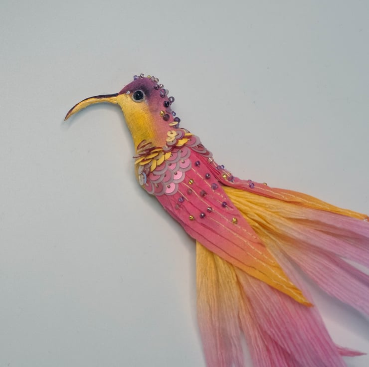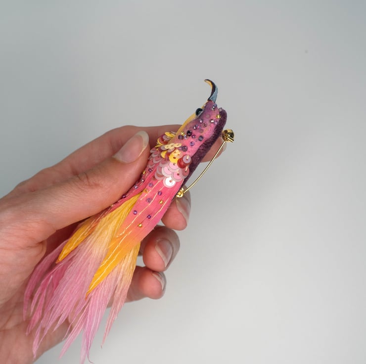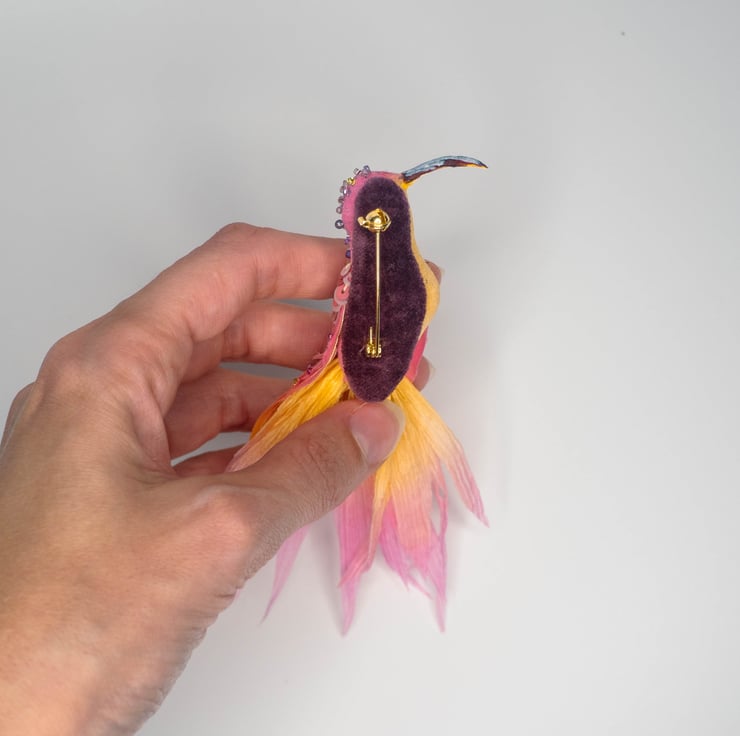 This small hummingbird brooch from the “Bird Park” collection presents a distinctive colourful design. Adorned with complex detailing, the embellishment has an upbeat (even holiday) feel. It only seems fragile. The beak and wings are rigid and safe for clothes.