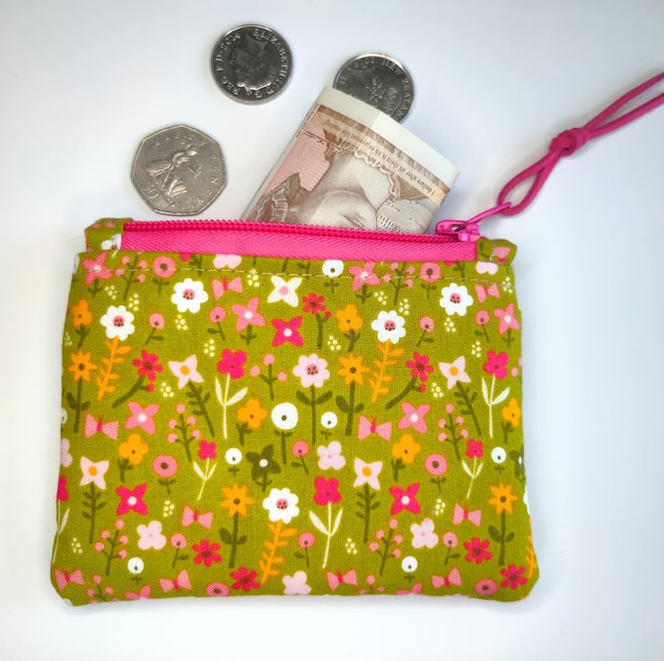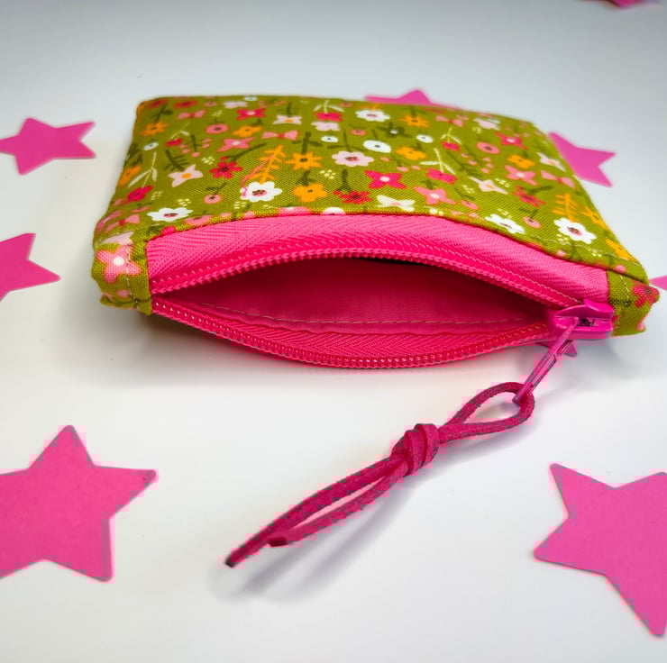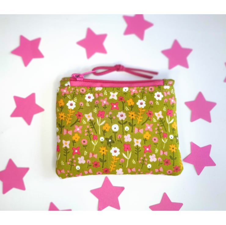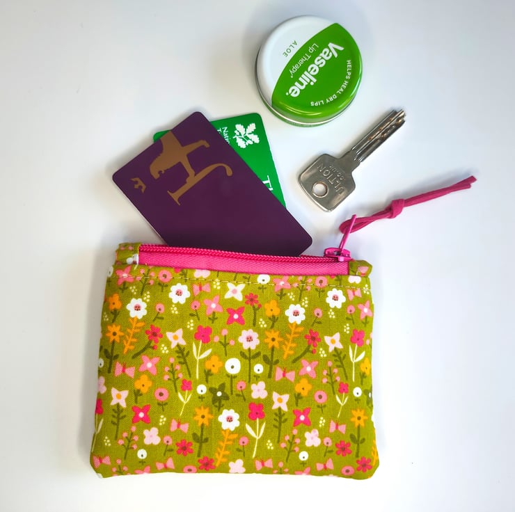 A pretty zipper pouch with ditsy flowers in pretty pinks. Ideal to use as a coin or credit card purse, ear buds bag or for plasters and medication.
