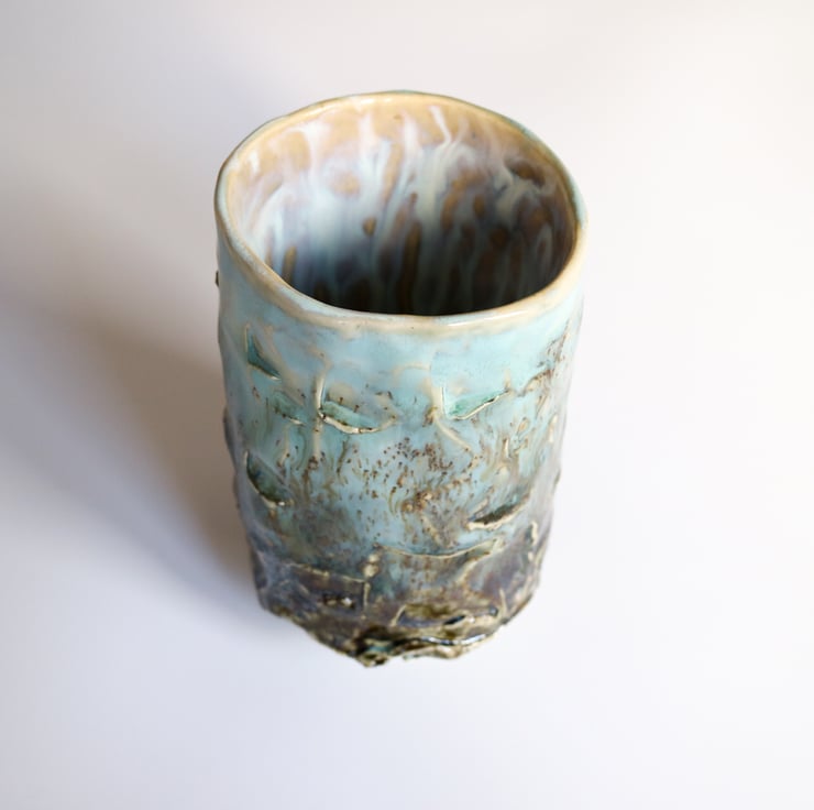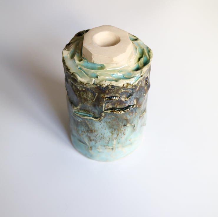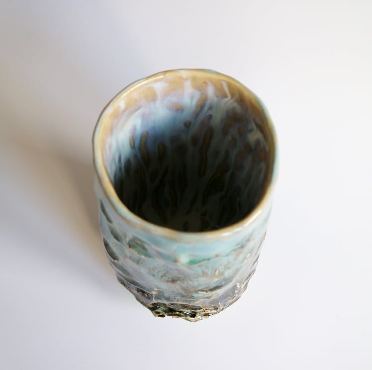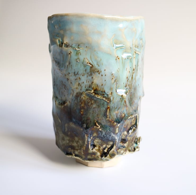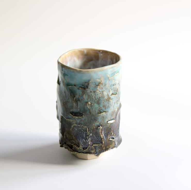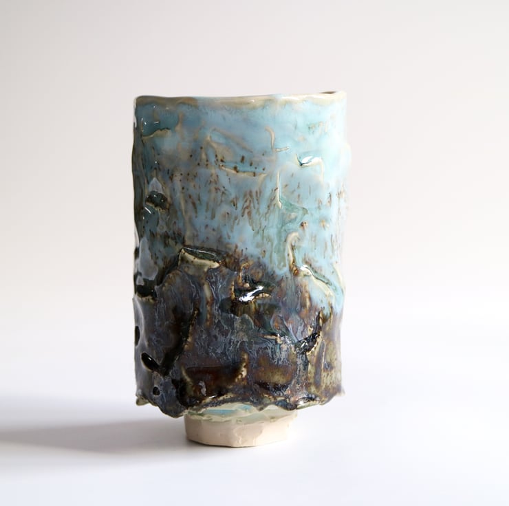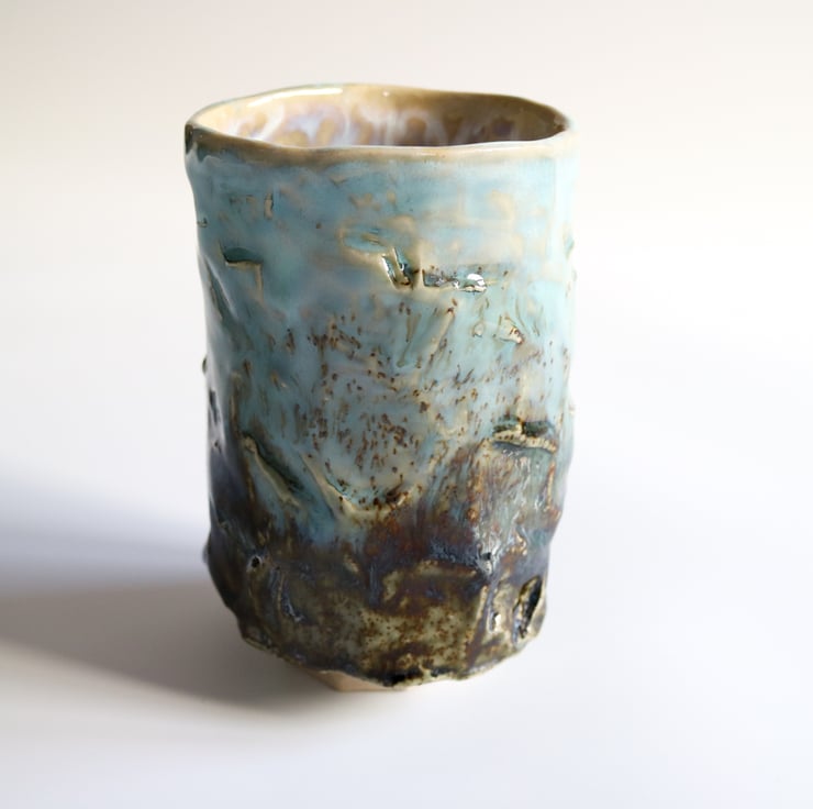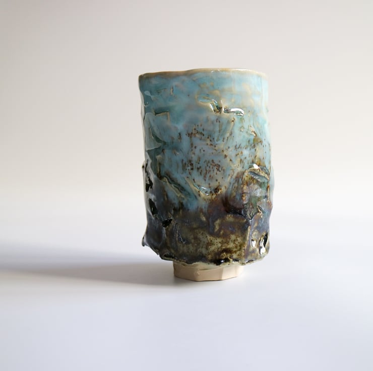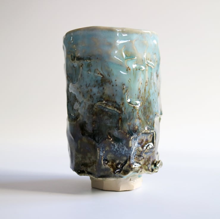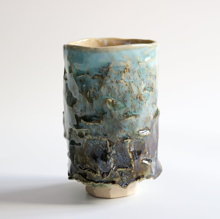 Handmade from stoneware this vessel is inspired by the Japanese process Kurinuki, carving from a solid piece of clay.