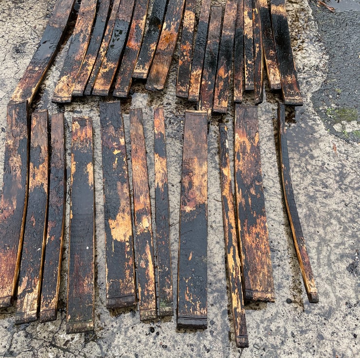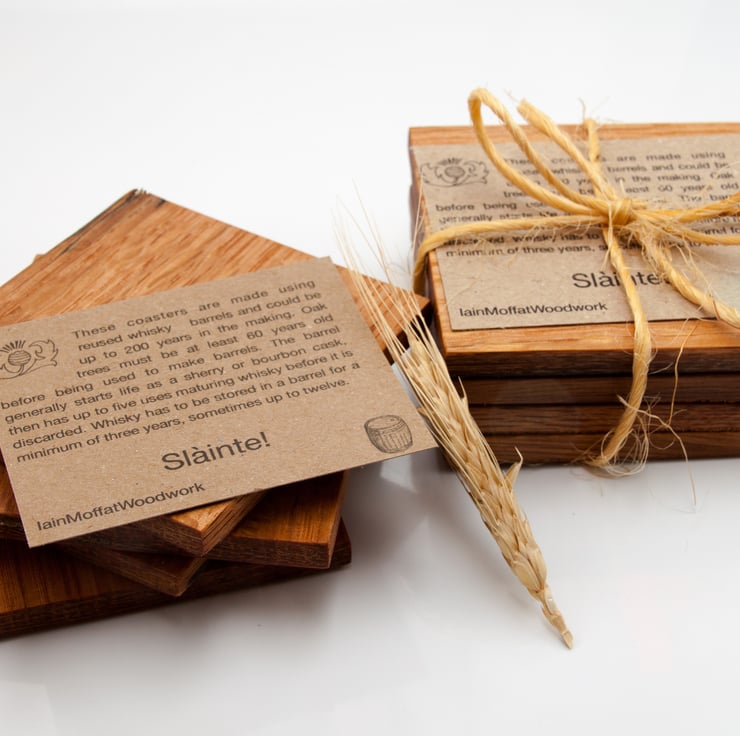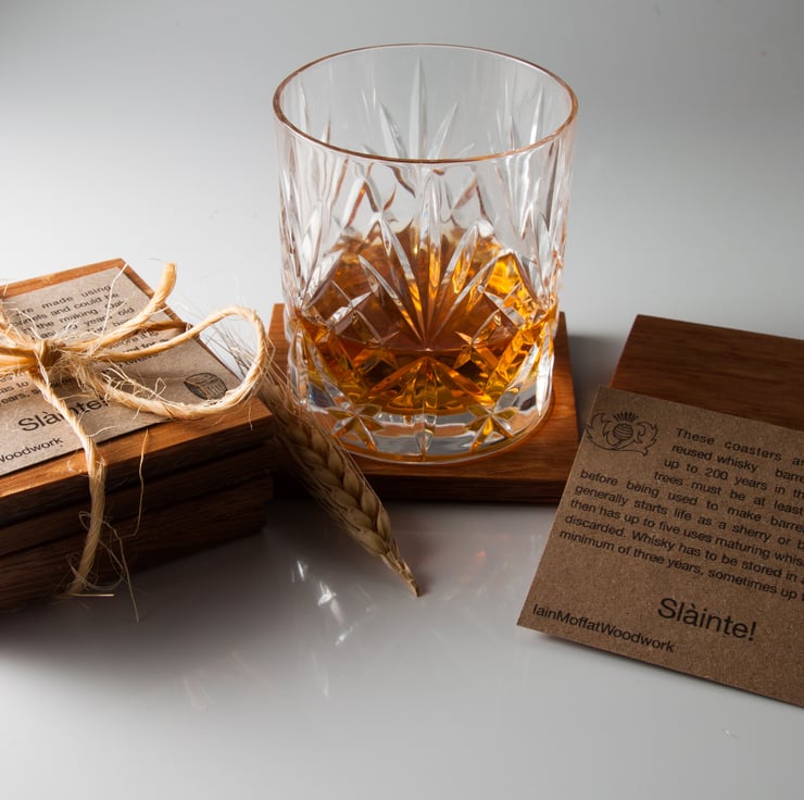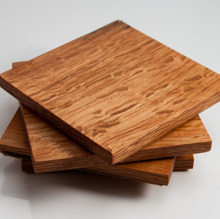 A set of four oak coasters made from reused whisky barrels.