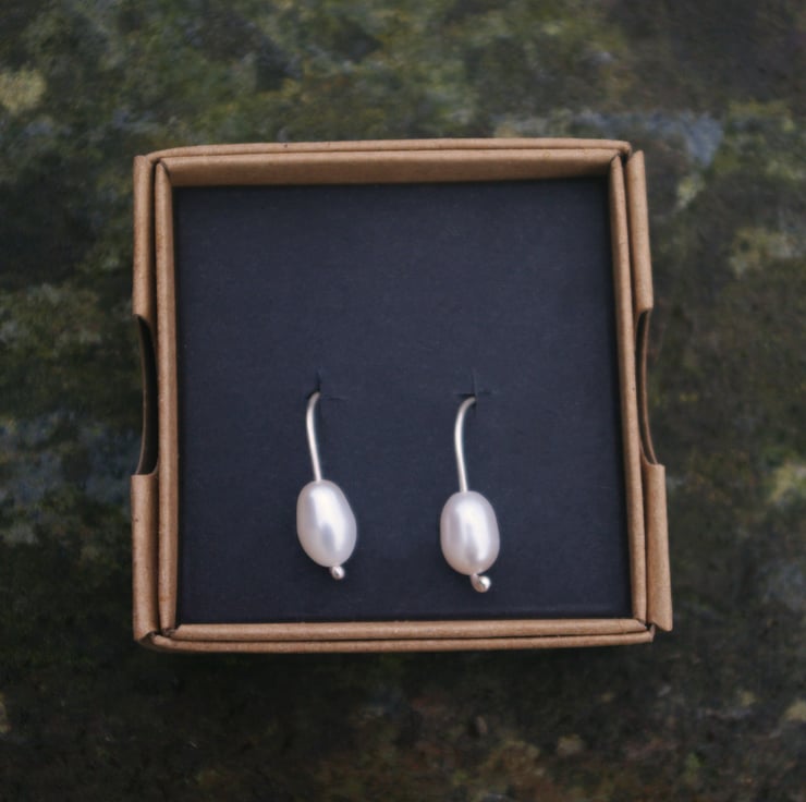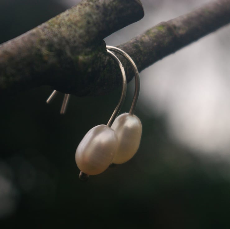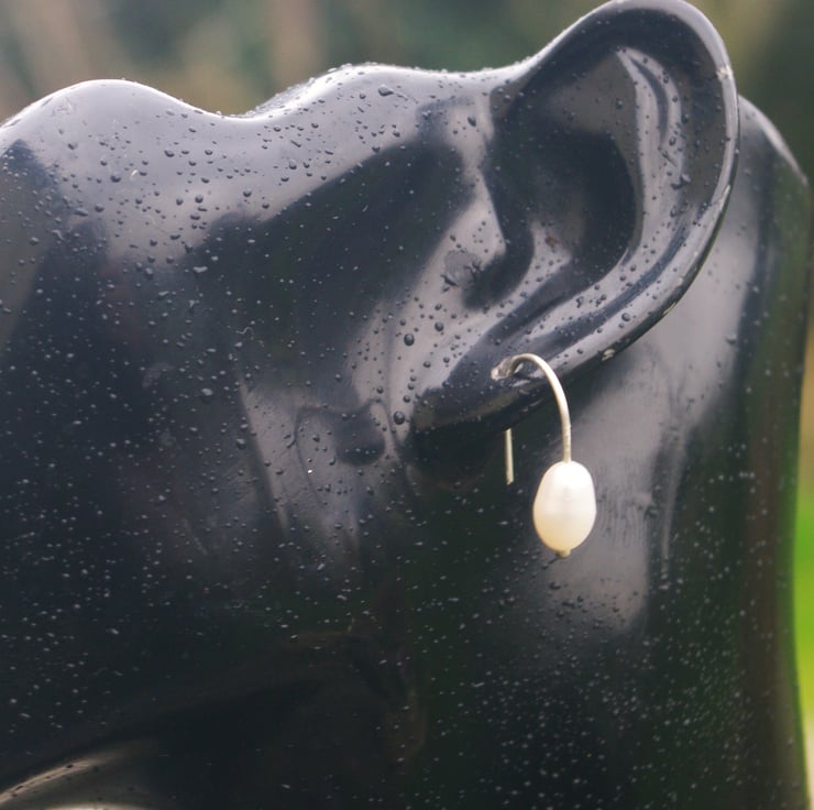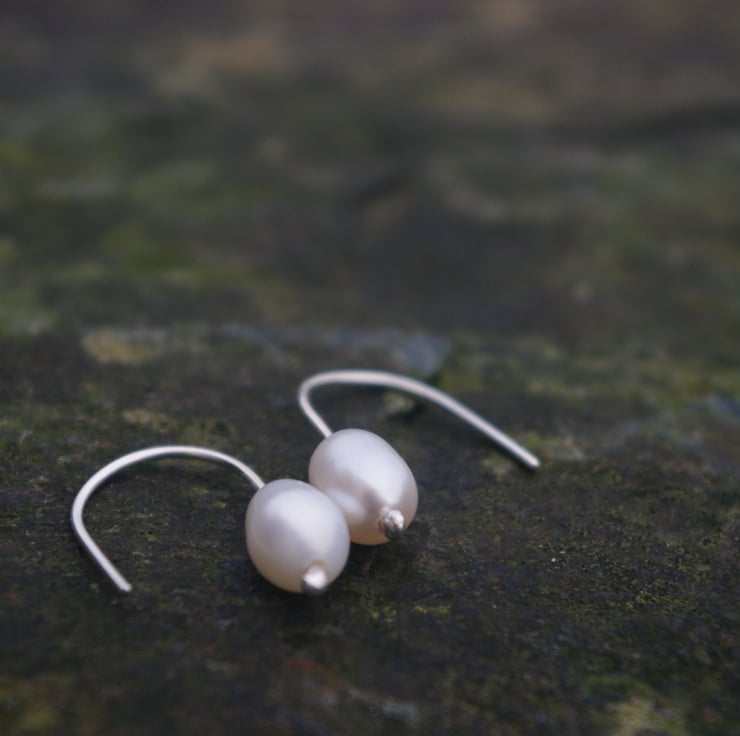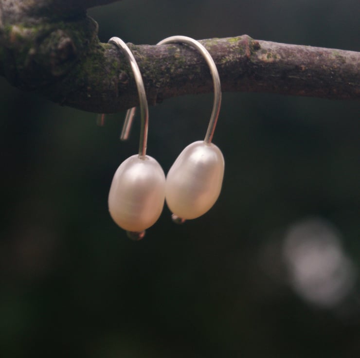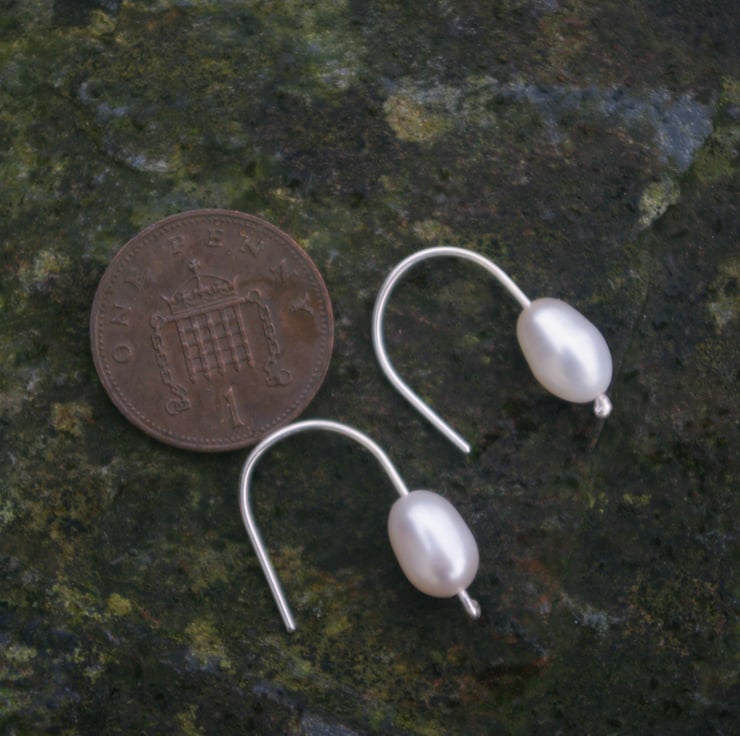 Earrings made from eco sterling silver 0.8mm wire, with a large good quality freshwater pearl designed to hang just off the earlobe. Simple, contemporary and elegant pearl earrings. The freshwater pearls are quite large at 6mm in diameter and 9mm long. The total dangle is short at about 20mm/ just over 0.75 inches.