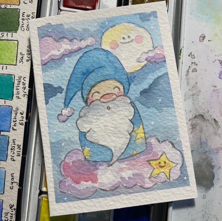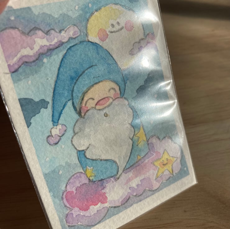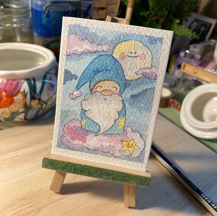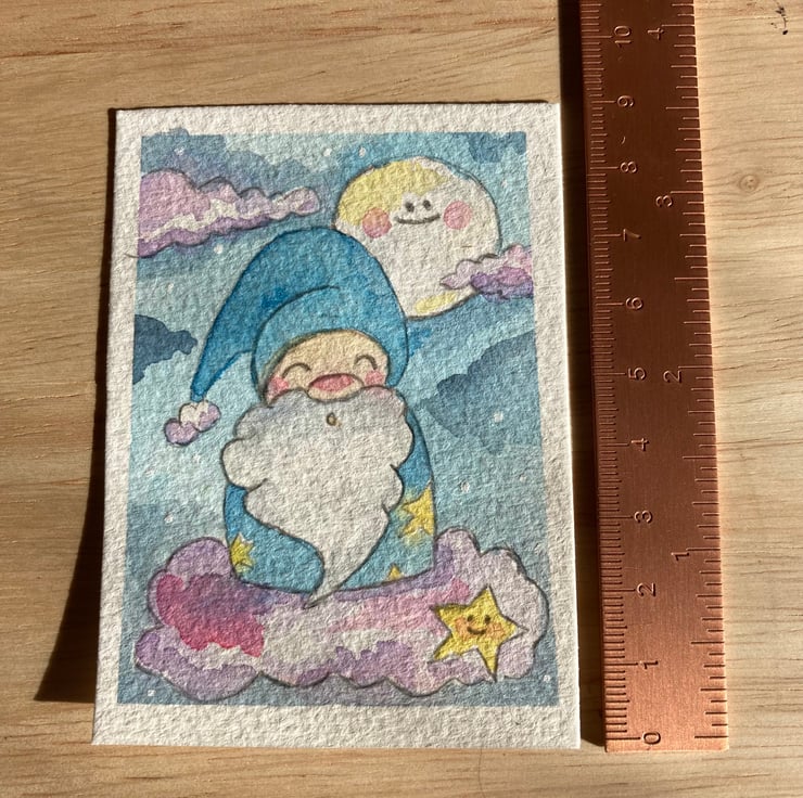 This ACEO is a miniature watercolour illustration of a very sleepy little gonk who lives in the clouds and is never seen out of his pyjamas. His best friends are the moon and stars but even when they are playing games he just cannot stop yawning!