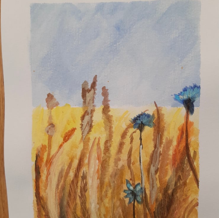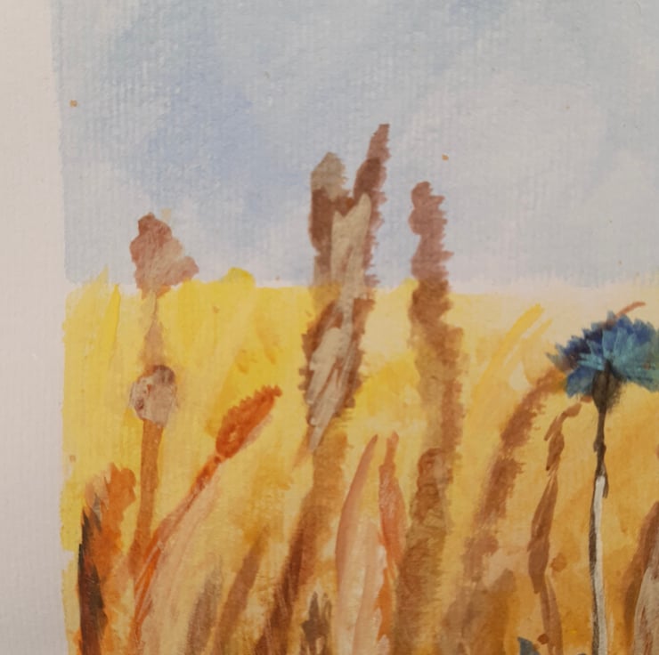 Water, colour, painting or watercolour paper, 10.5 times 7.5 inches. Showing its crisp cornfield with wildflowers and various seed like corn .