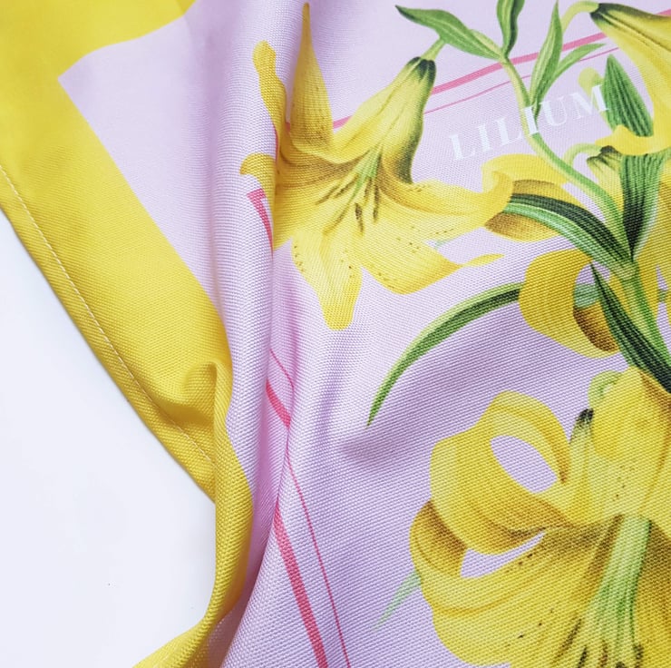 - Vintage botanical drawing of a Lily (Lilium Monadelphum) set against a pretty pink background and bordered in yellow.