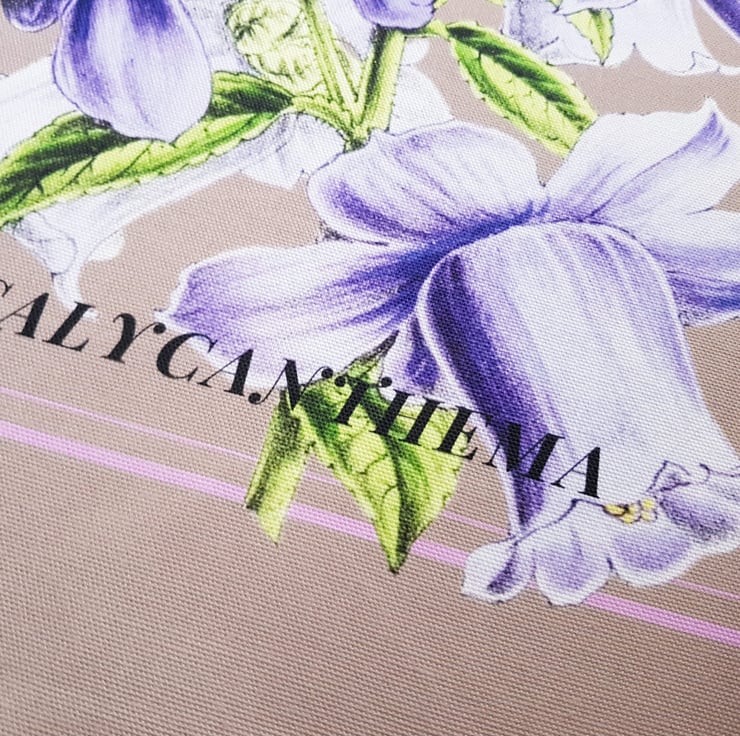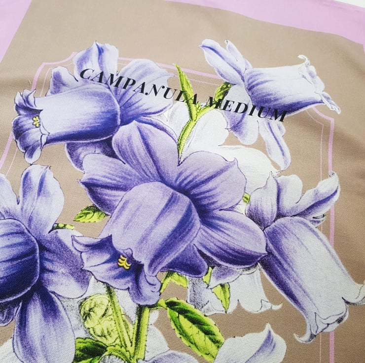 - Vintage botanical drawing of Campanula (Bellflower) set against a beige background and bordered in a youthful pink.