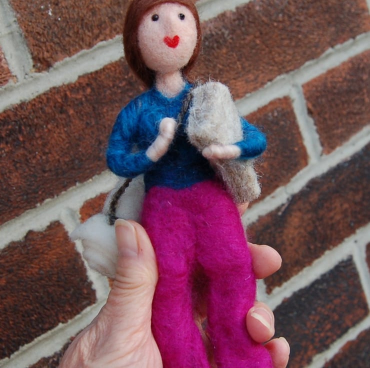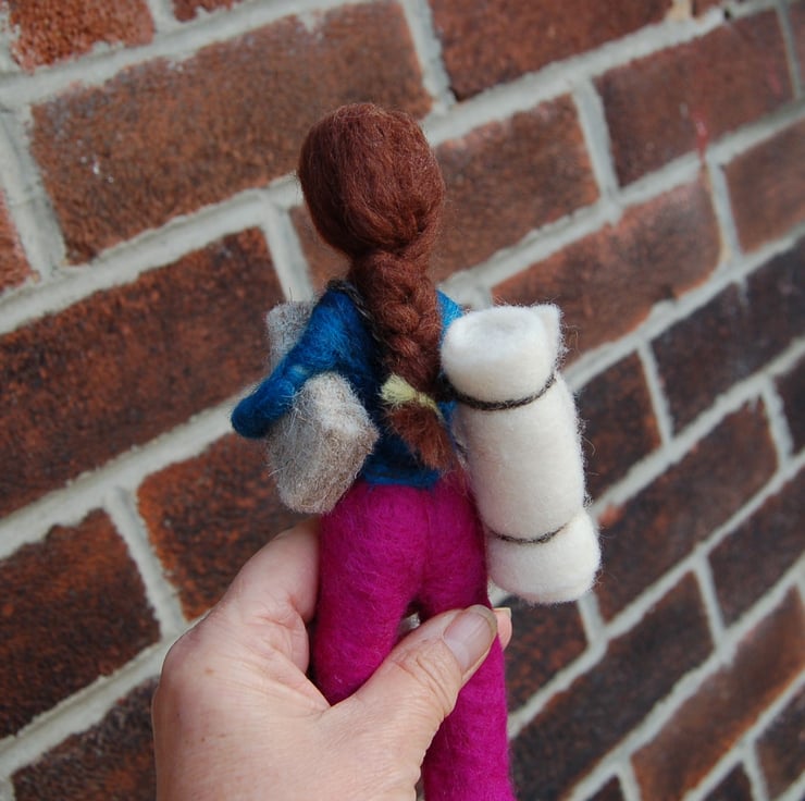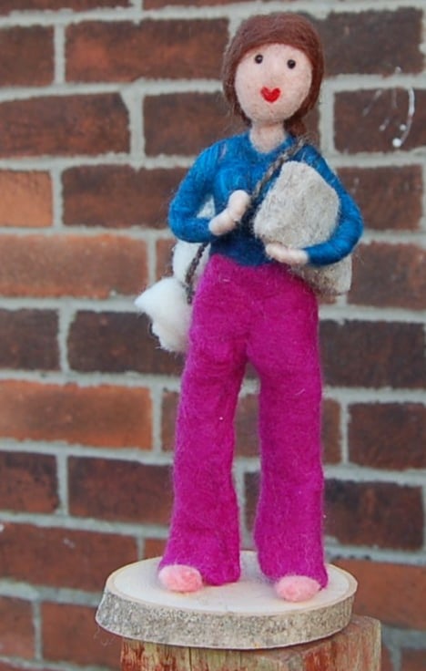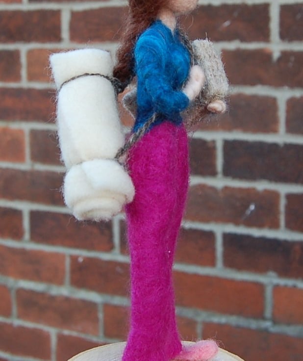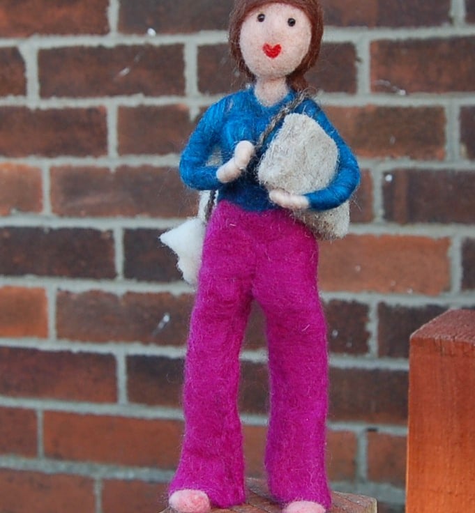 Becky is a needle felt sculpture with poseable arms and legs. She is going to yoga with her mat over her shoulder and block under her arm.