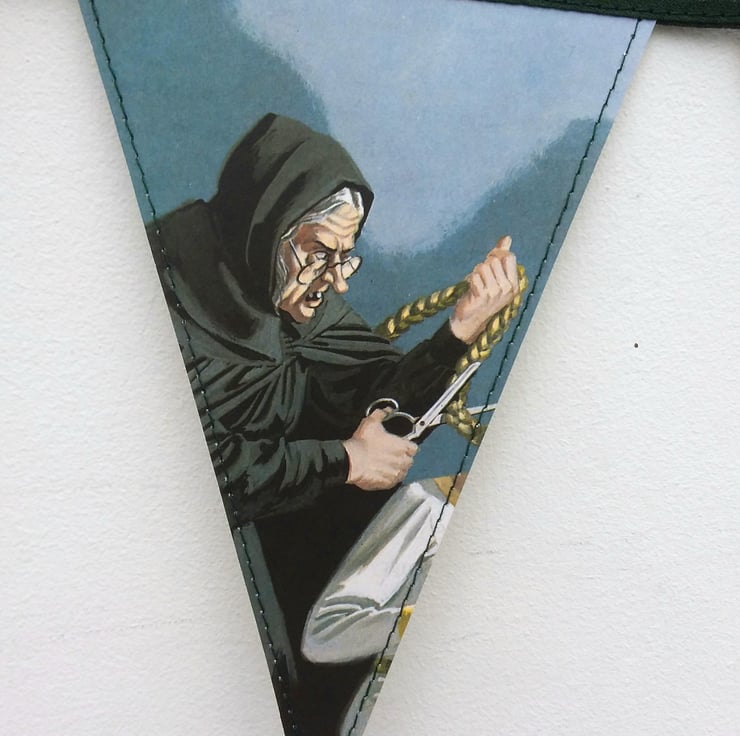 There are 25 triangular flags measuring 10cm x 17cm hung 2cm apart. The colour images are on the face of the bunting and the story on the reverse.