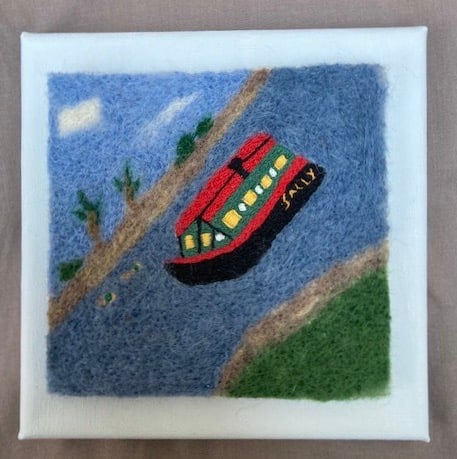'Sally' the canal boat has been hand embroidered onto a needle felted background of the canal & surrounding pathways. Can you spot the two little ducks in the canal? The picture, which measures 11.5cm x 12 cm has been mounted on a blue painted canvas board making the final piece of art measure 15cm x 15cm.