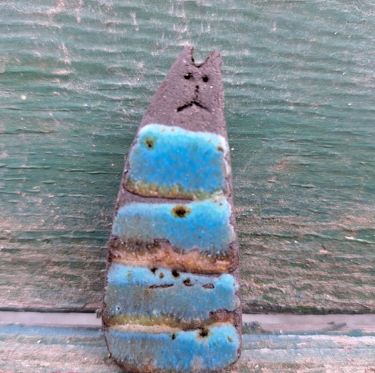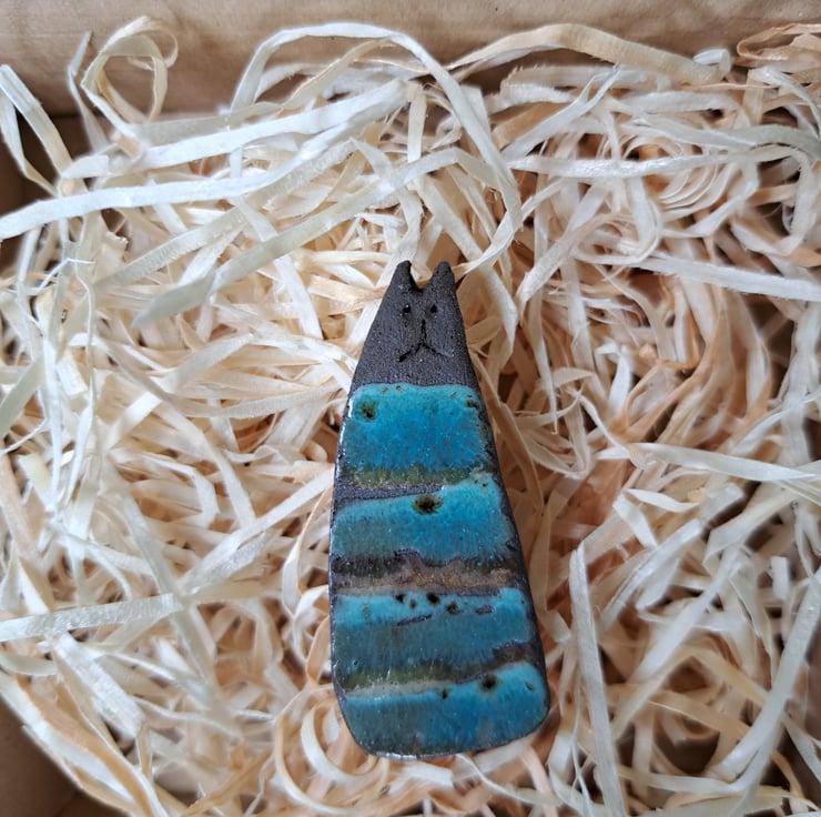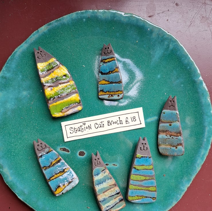 Station Cat Brooch, handcrafted here at the Station Cat Pottery.