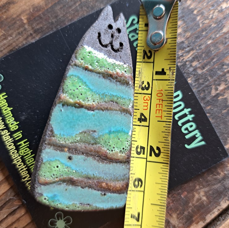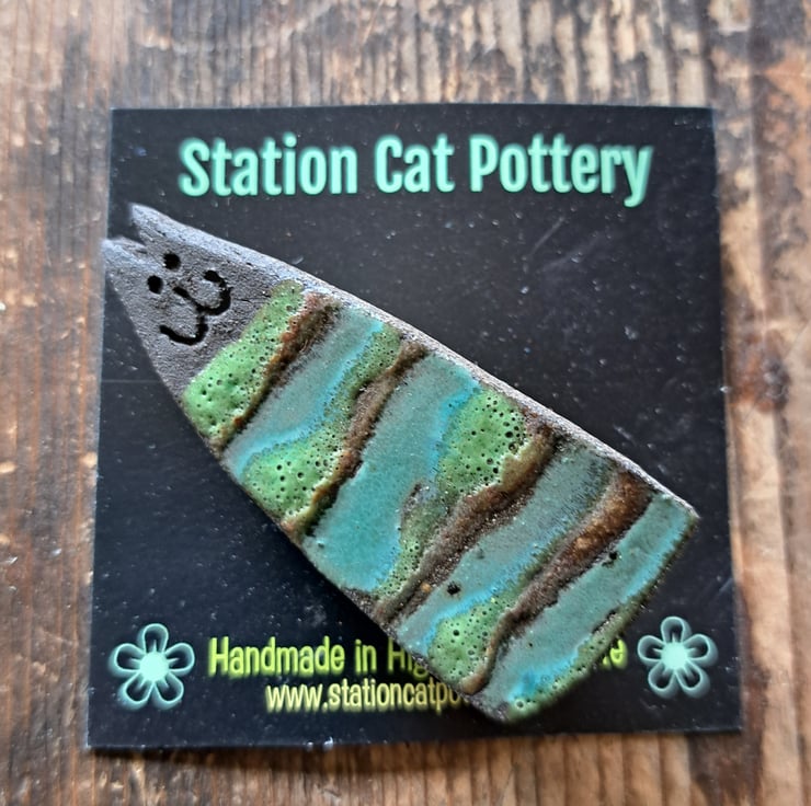 Station Cat Brooch, handcrafted here at the Station Cat Pottery.