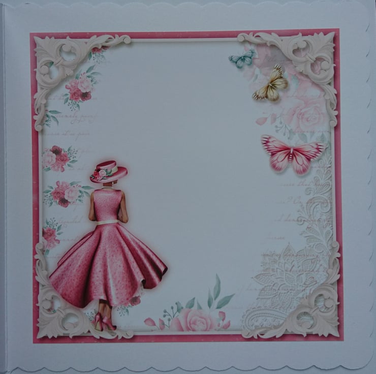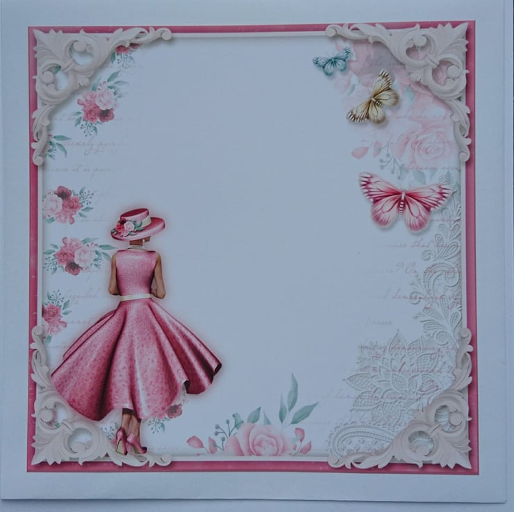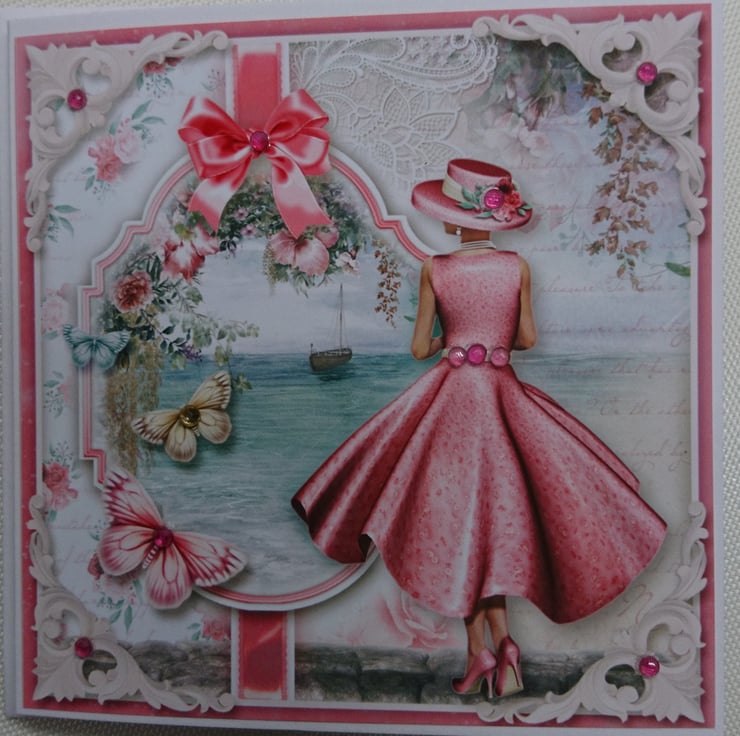 The design is a chic lady dressed up in a gorgeous 3D pink statement dress with a matching hat and high heels. She is looking out over the ocean at a boat on the water - who is she waiting for?