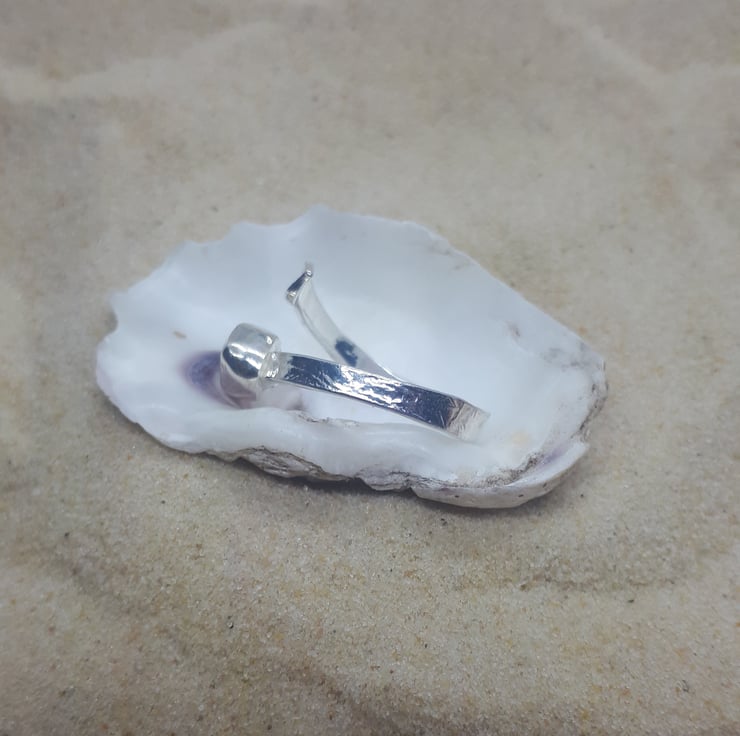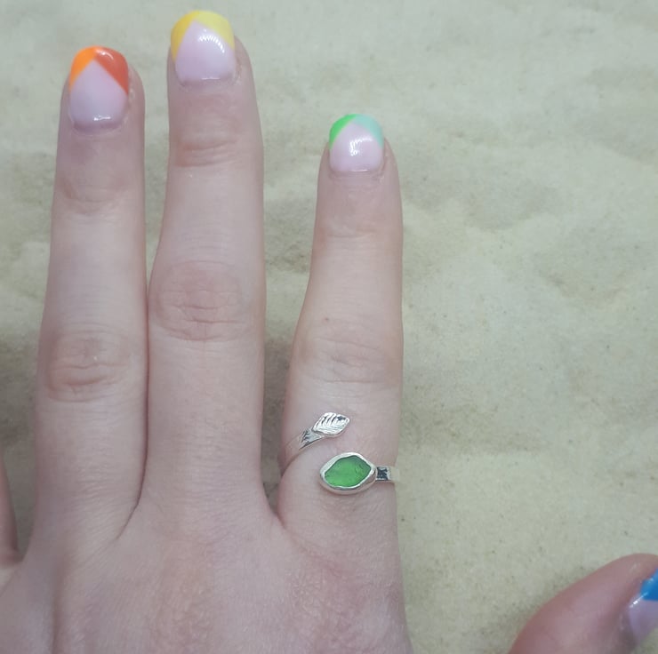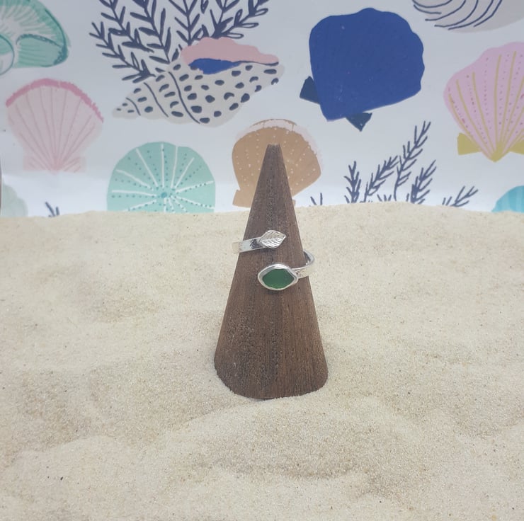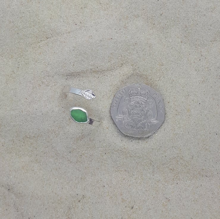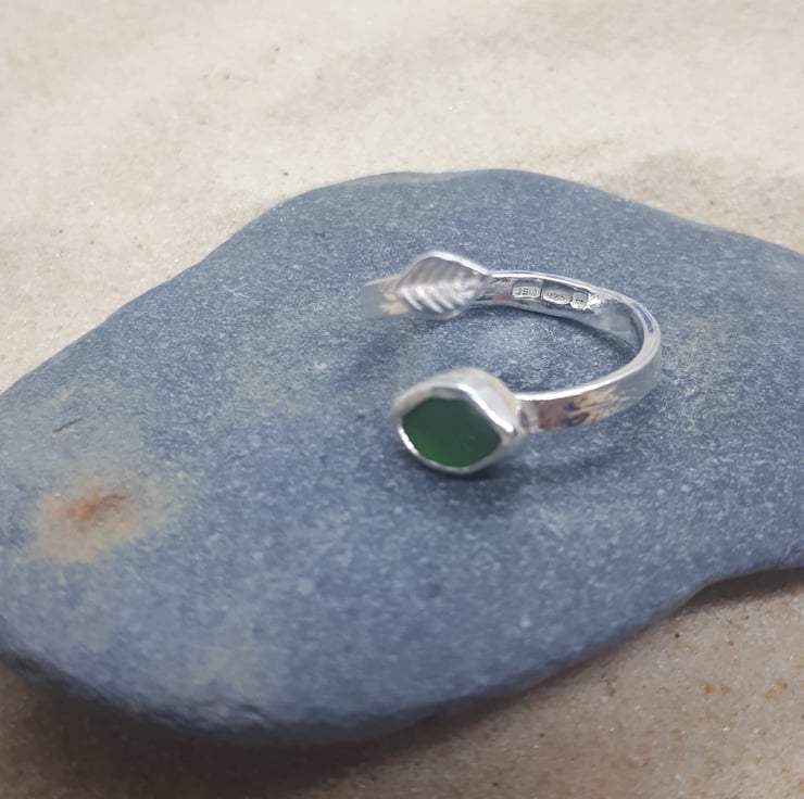 A genuine piece of UK sea glass (moss green) set in fine silver bezel on a hammered sterling silver band with a fine silver leaf.