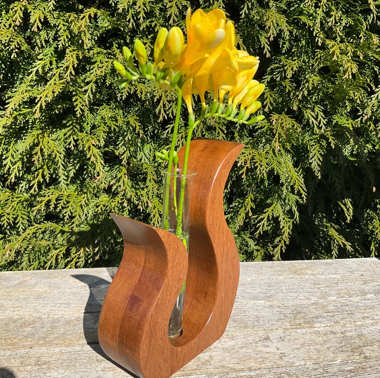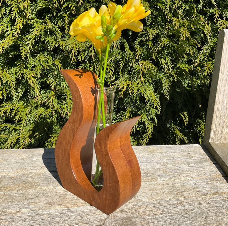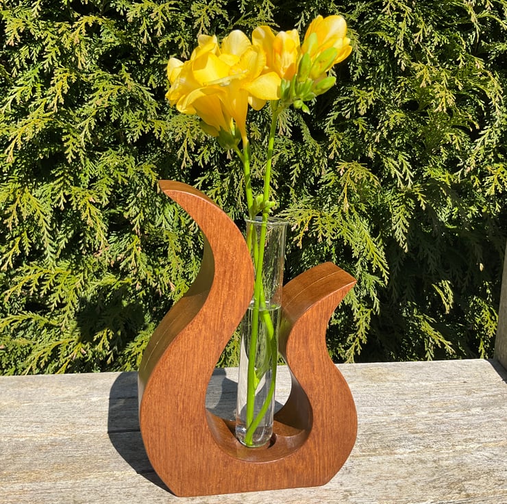 A stylish bud vase made from wild mango wood in a attractive and stylish flared pattern which supports a borosilicate glass tube. The frame and edges are rounded and sanded to provide a very smooth tactile surface. The vase is finished in durable oil to a light satin finish. The vase overall dimensions being 135mm w x 185mm ht x 48mm thick. The tube being 150mm high x 24mm diameter.