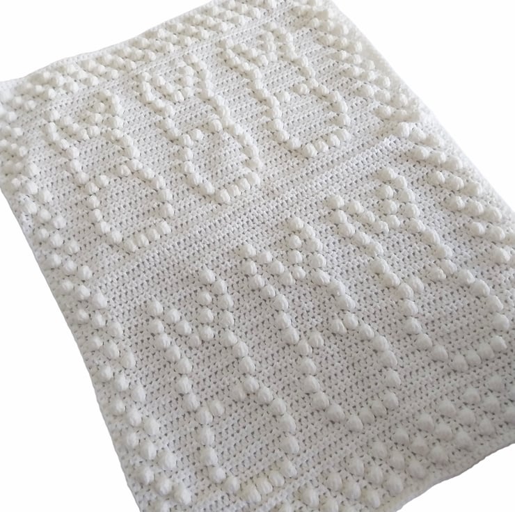 Wrap your little one in softness and style with this charming hand-crocheted baby blanket in white. Featuring adorable bunny designs and a fun bobble stitch border, it's perfect for snuggles, naps, or strolls.