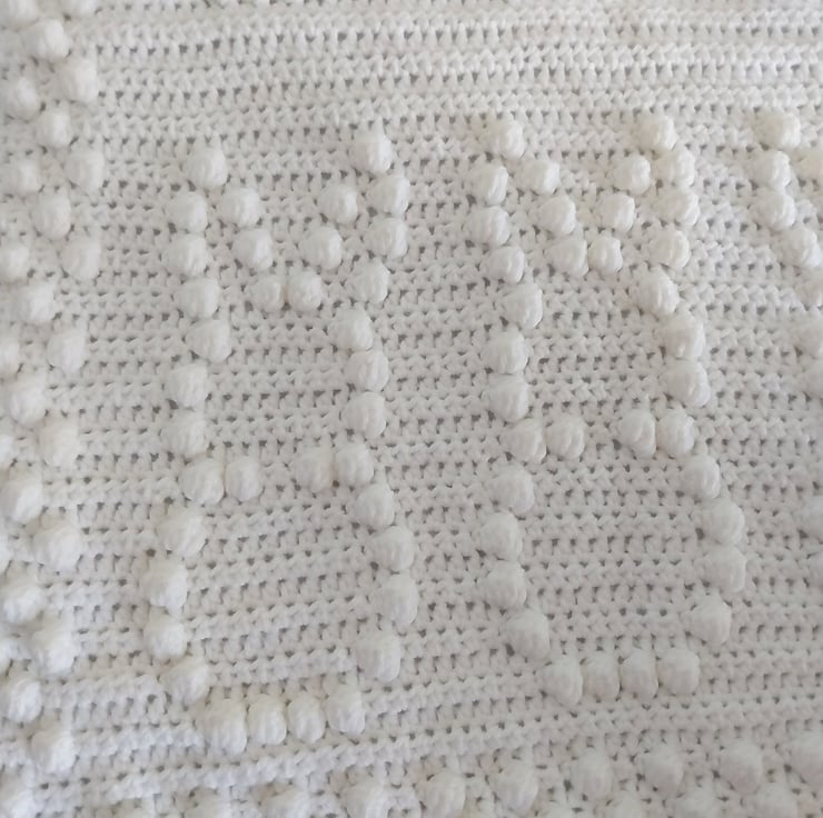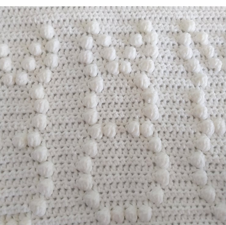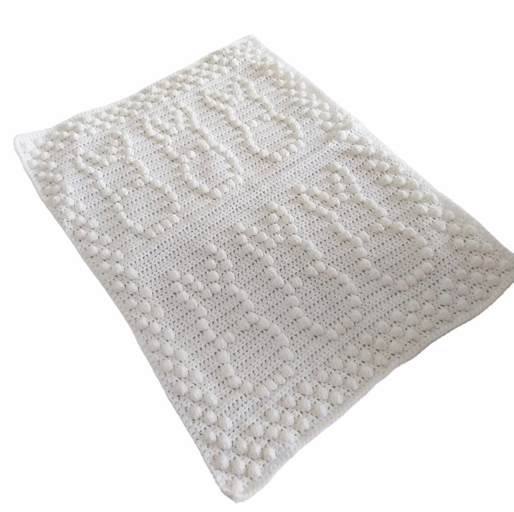 Wrap your little one in softness and style with this charming hand-crocheted baby blanket in white. Featuring adorable bunny designs and a fun bobble stitch border, it's perfect for snuggles, naps, or strolls.