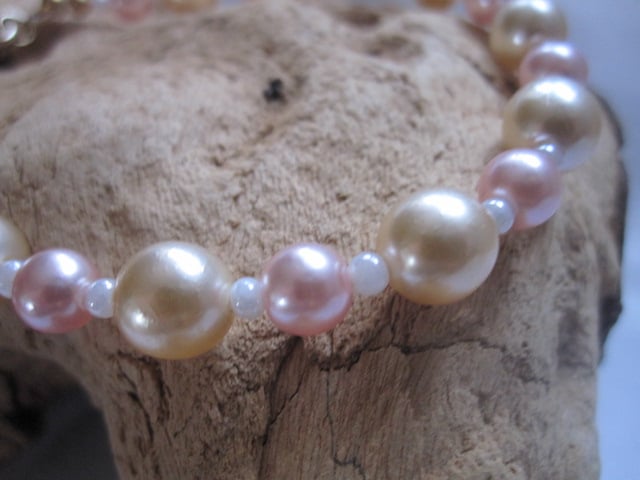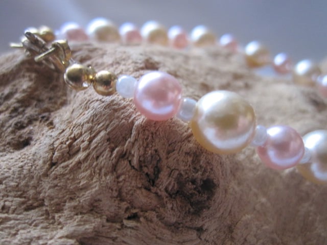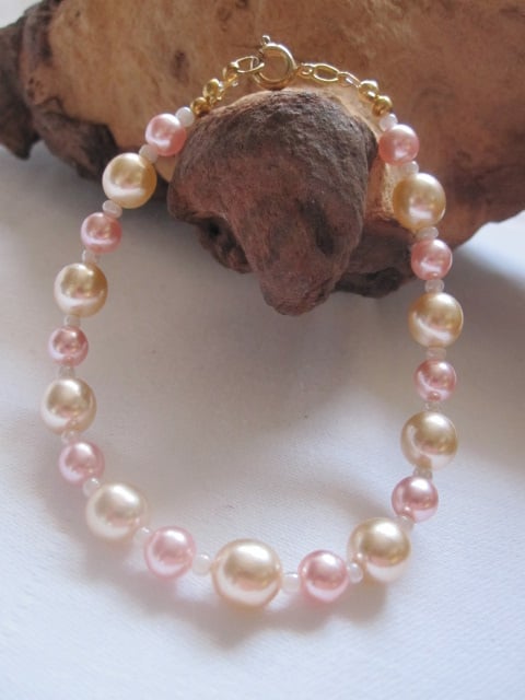 This lovely little light weight bracelet is made using glass imitation round pearls. The larger pears are cream and the small ones are a pale pink colour. Between each pearl is a white pearl effect seed bead. The bracelet is finished off with gold plated findings including a bolt ring clasp. It is approx. 20.5cm from end to end and the largest bead is approx. 8mm in diameter. This bracelet will come in an organza bag. Gift boxed options are available at checkout.