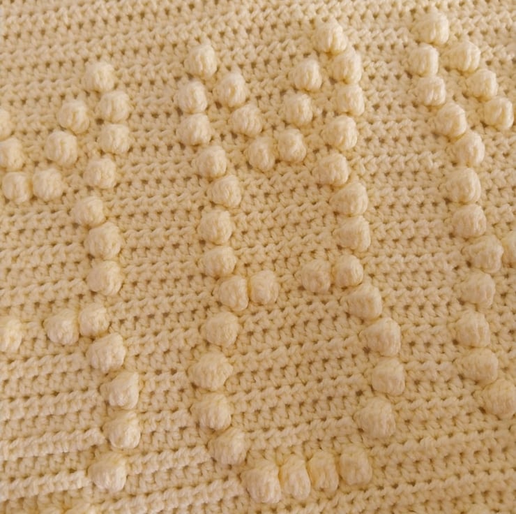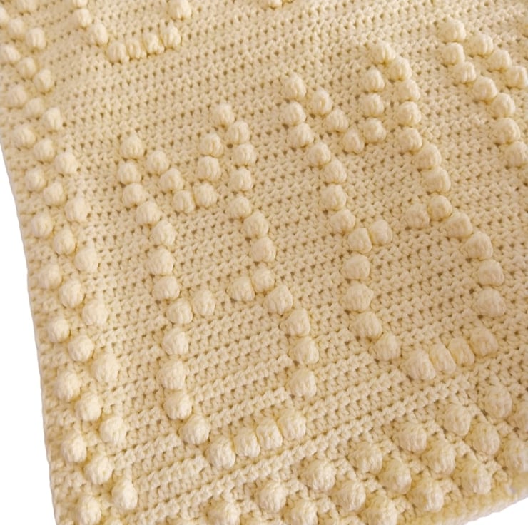 Cuddle your little one in this charming hand-crocheted baby blanket in a soft lemon hue. With its adorable bunny designs and playful bobble stitch border, it's perfect for snuggles, naps, or strolls.