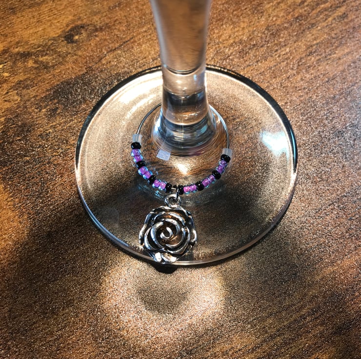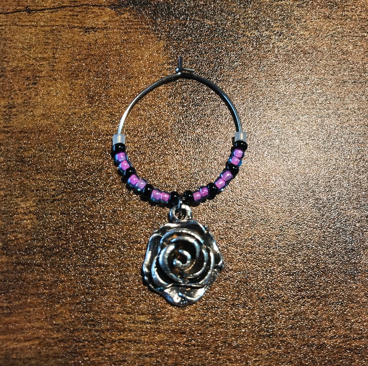 Top quality Czech black and magenta seed beads on stainless steel wire with beautifully detailed antique silver rose charm.