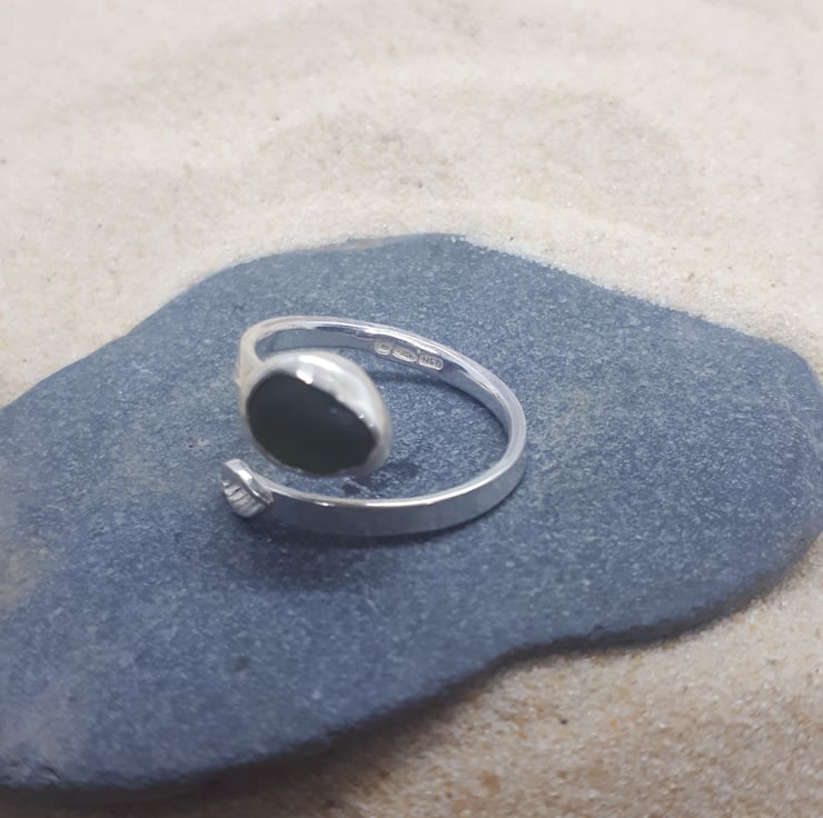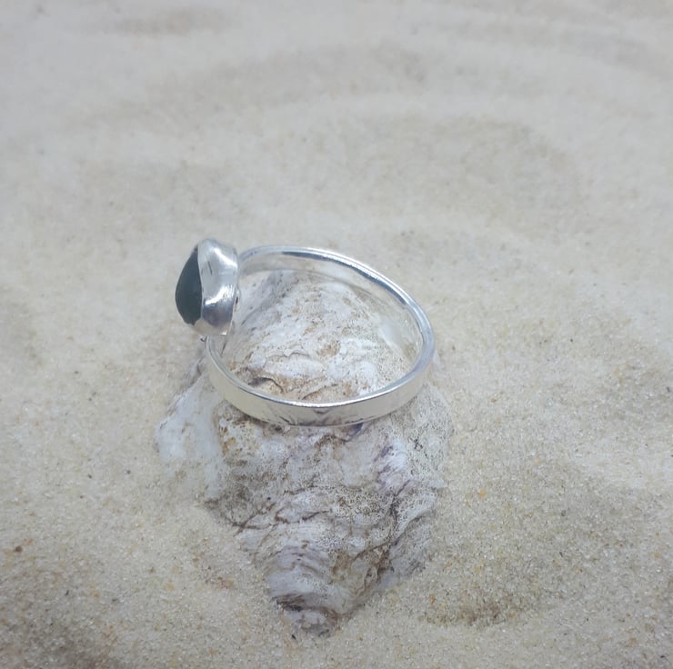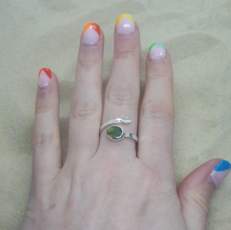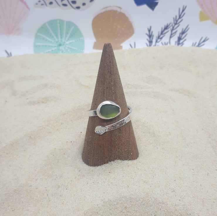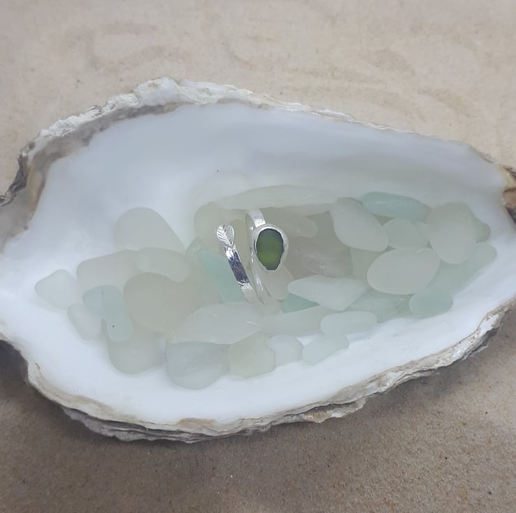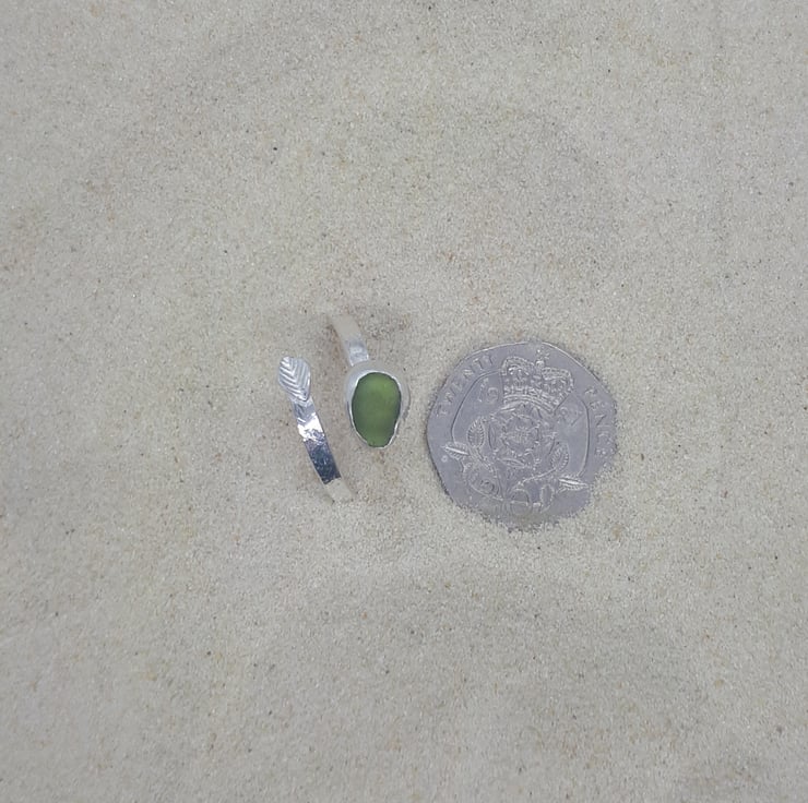 This sea glass ring features a genuine piece of UK sea glass (olive green), set in a real fine silver bezel on a hammered sterling silver band with a delicate, fine silver leaf.