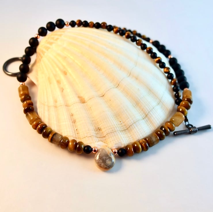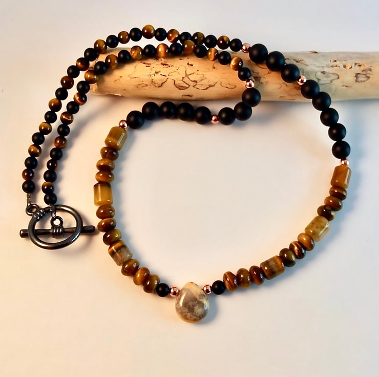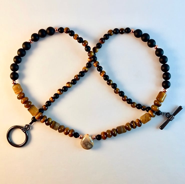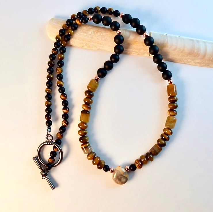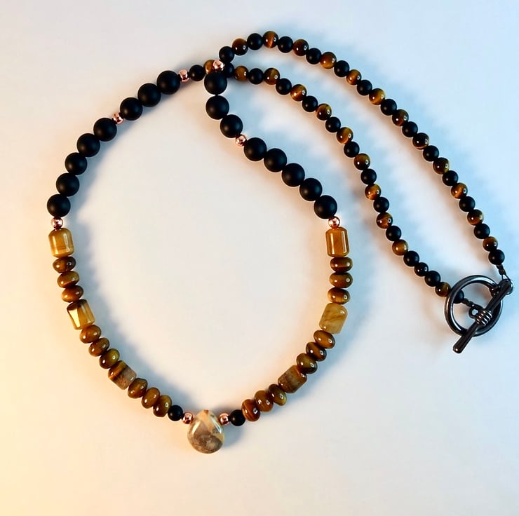 The necklace then graduates from 6mm frosted black Onyx to a mix of 4mm Tiger's Eye and frosted black Onyx.