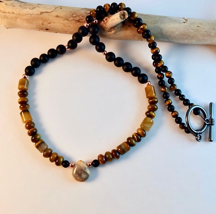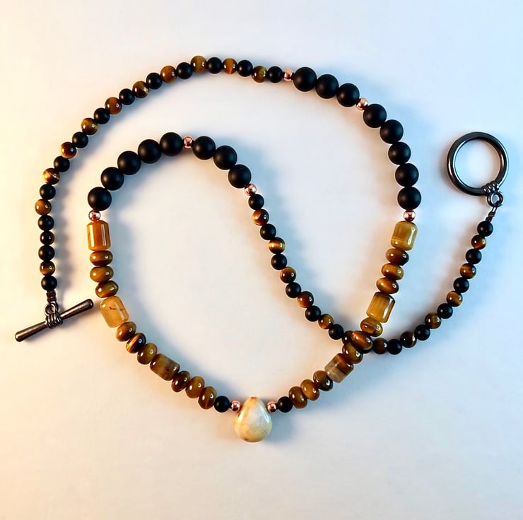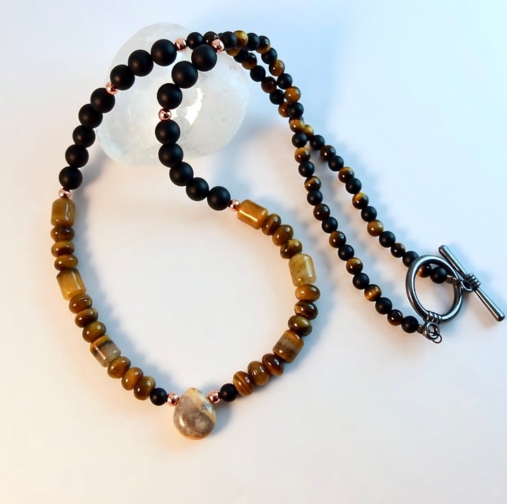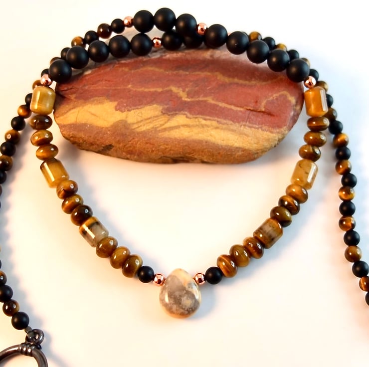 This attractive, unisex necklace features a small, 10x12mm Agate teardrop, highlighted with copper and frosted black Onyx round beads, and set between trios of 6x4mm Tiger's Eye rondelles that alternate with 6x8mm Tiger's Eye tubes.