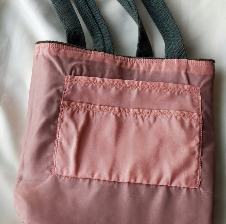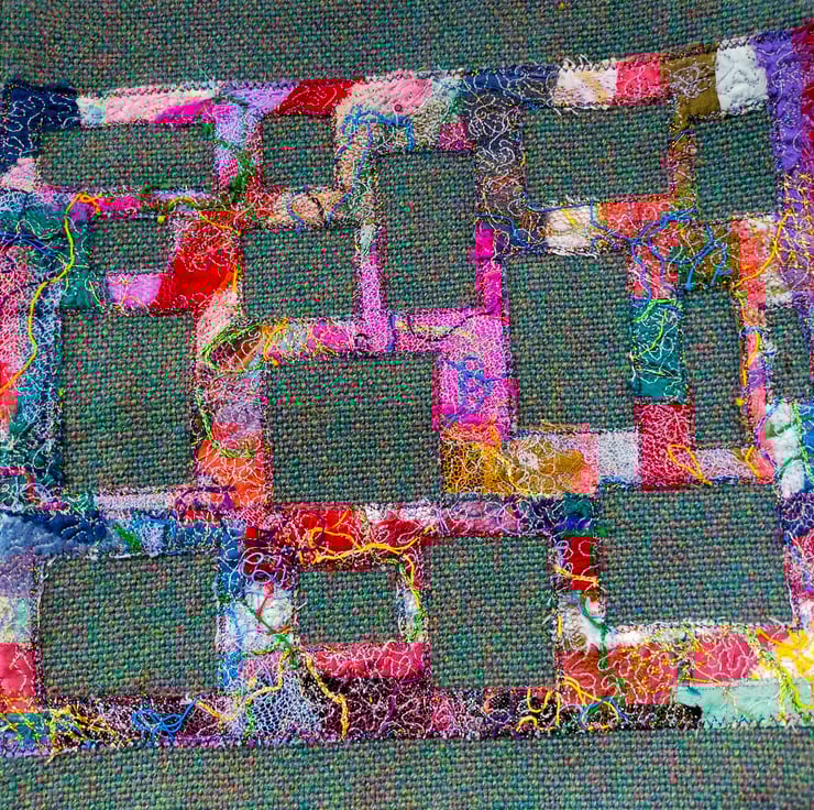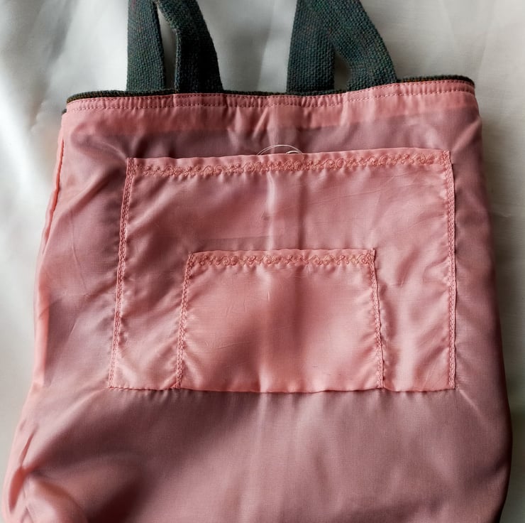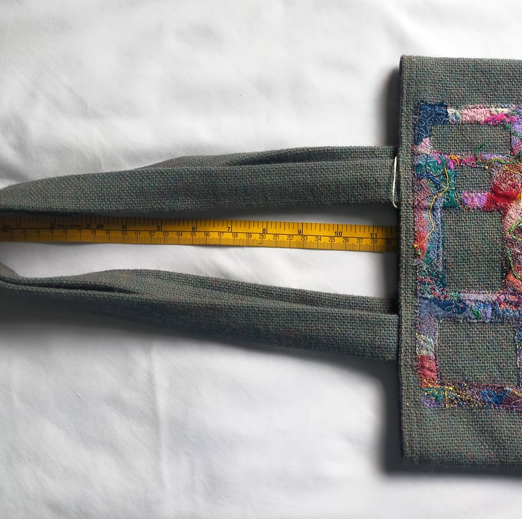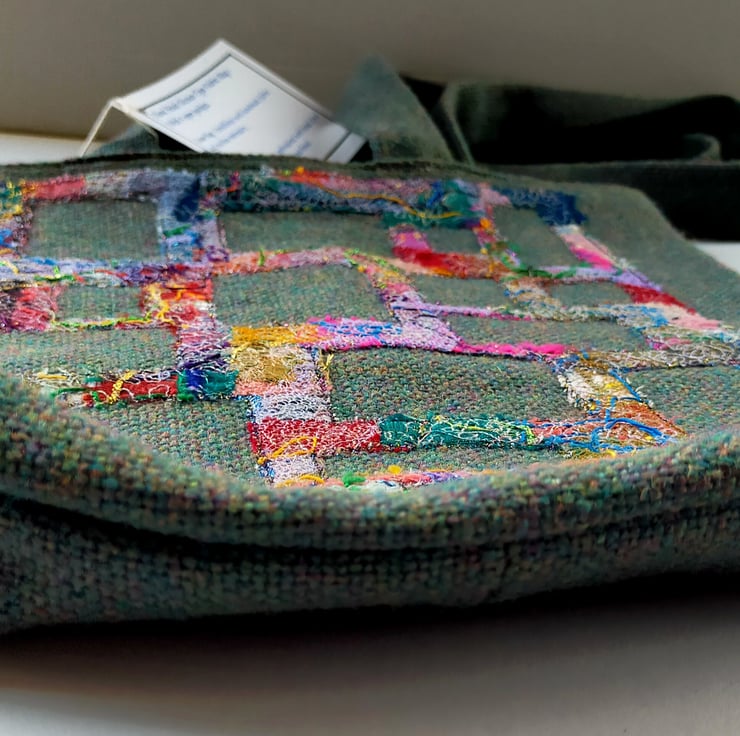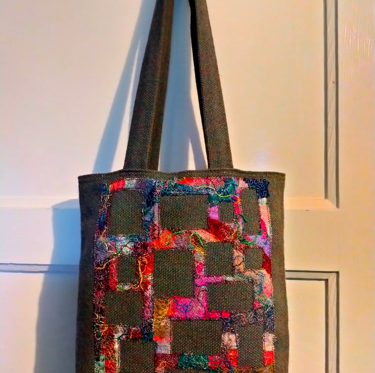 The handmade fabric has had various squares and oblongs cut out and removed leaving an open frame which has been appliqued to the bag front.