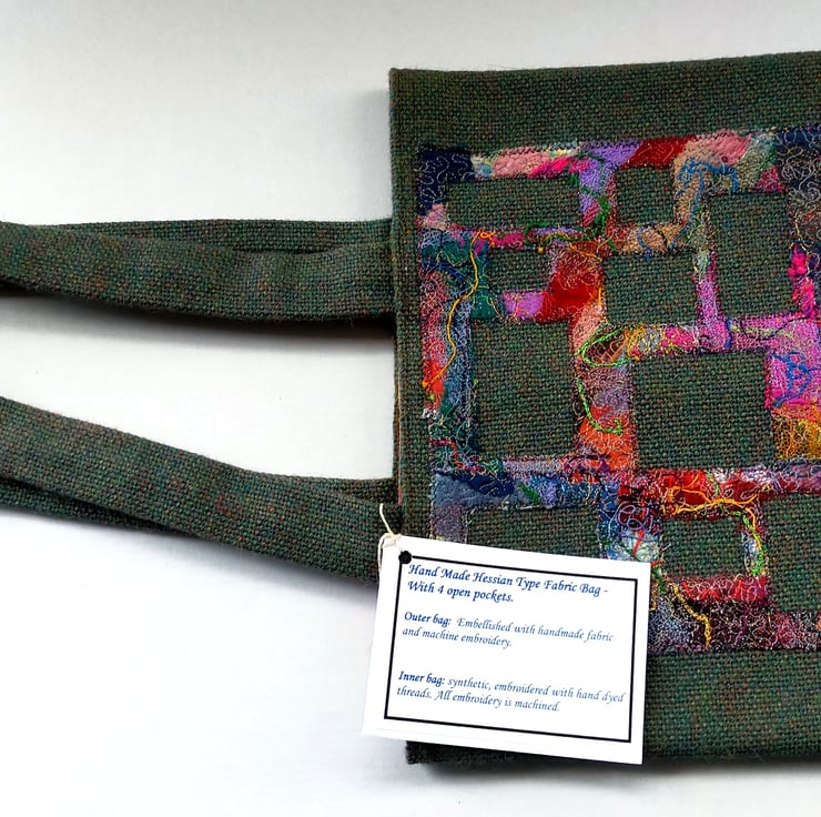 Outer bag: fabric – hessian type, embellished with handmade fabric and machine embroidery