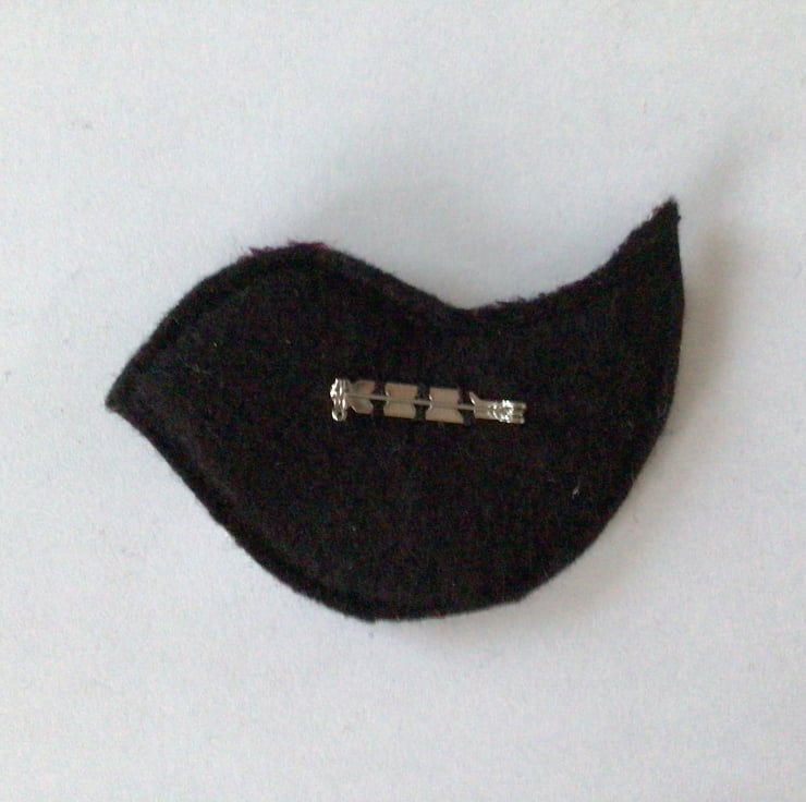 A purple tweed wool textile bird brooch handmade from repurposed wool and fabric scraps. The brooch is stiffened with buckram.