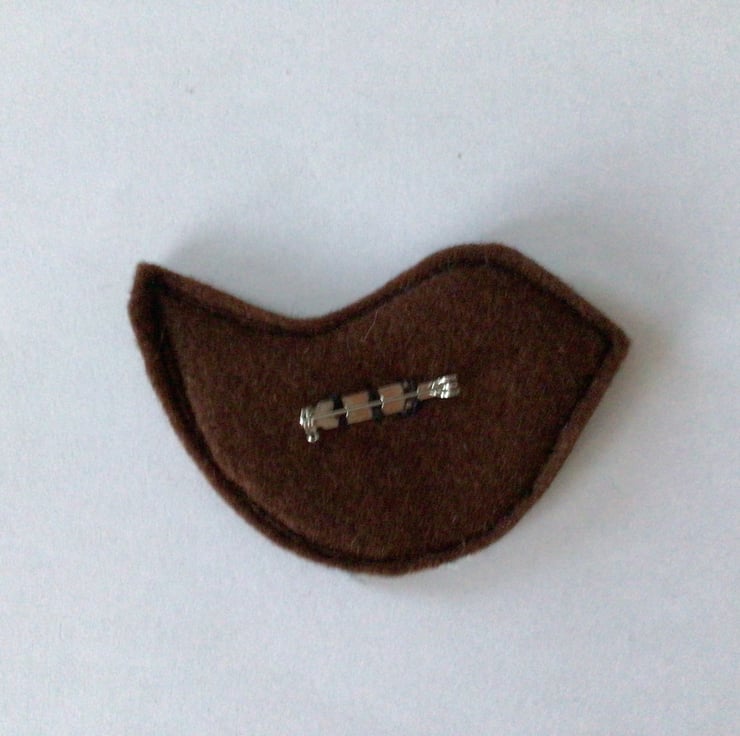 A brown tweed wool textile bird brooch handmade from repurposed wool and fabric scraps. The brooch is stiffened with buckram.