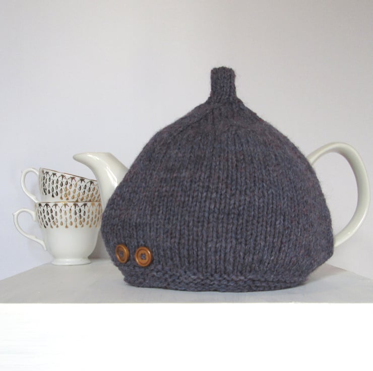 This purple heather tea cosy is hand knitted in a lovely and warm Aran wool, which comprises of 25% pure wool and 75% acrylic. It has 4 wooden buttons, 2 sewn on either side of the tea cosy, for decoration and a looped stalk at the top.
