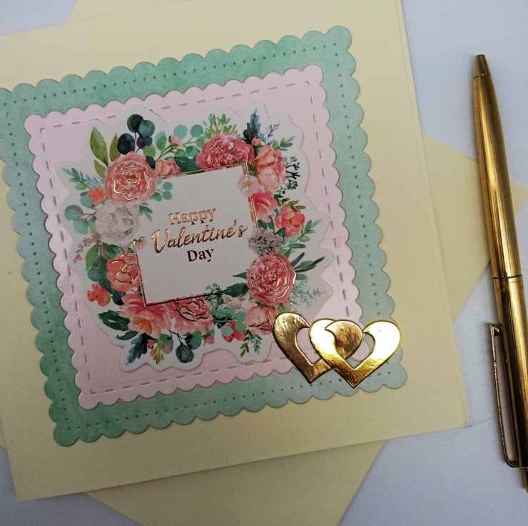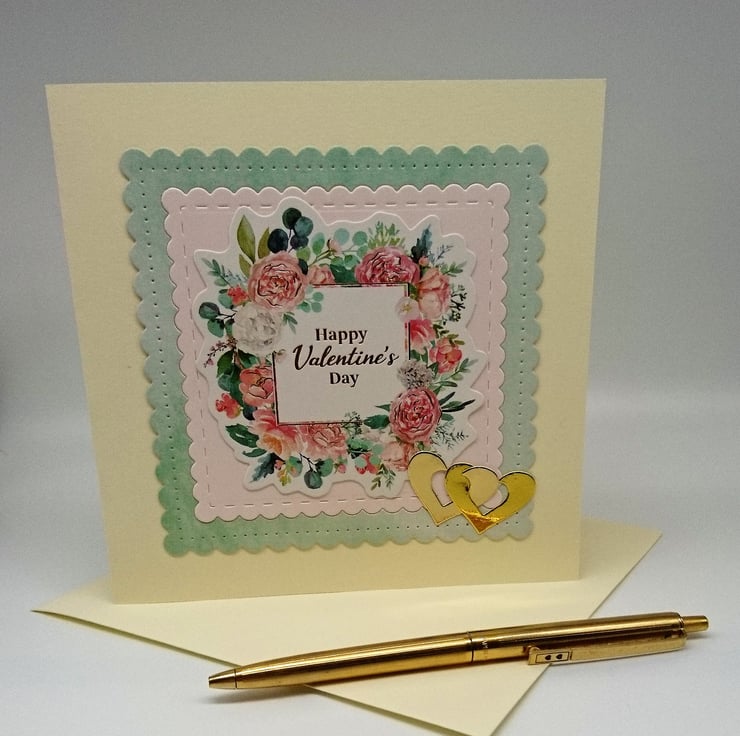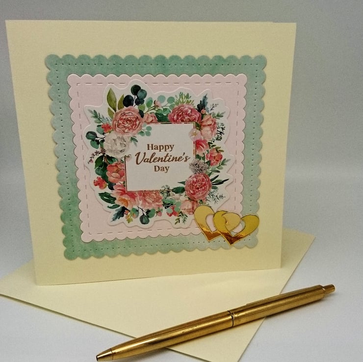 DESCRIPTION: Cream card with beautiful floral sentiment in the centre layered onto pale pink and pale green scalloped backgrounds, completed with two intertwined gold hearts.