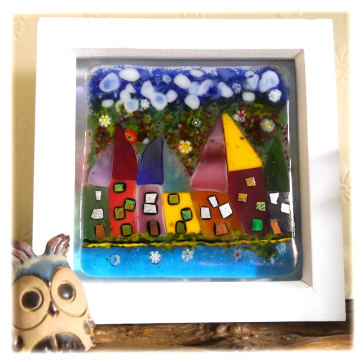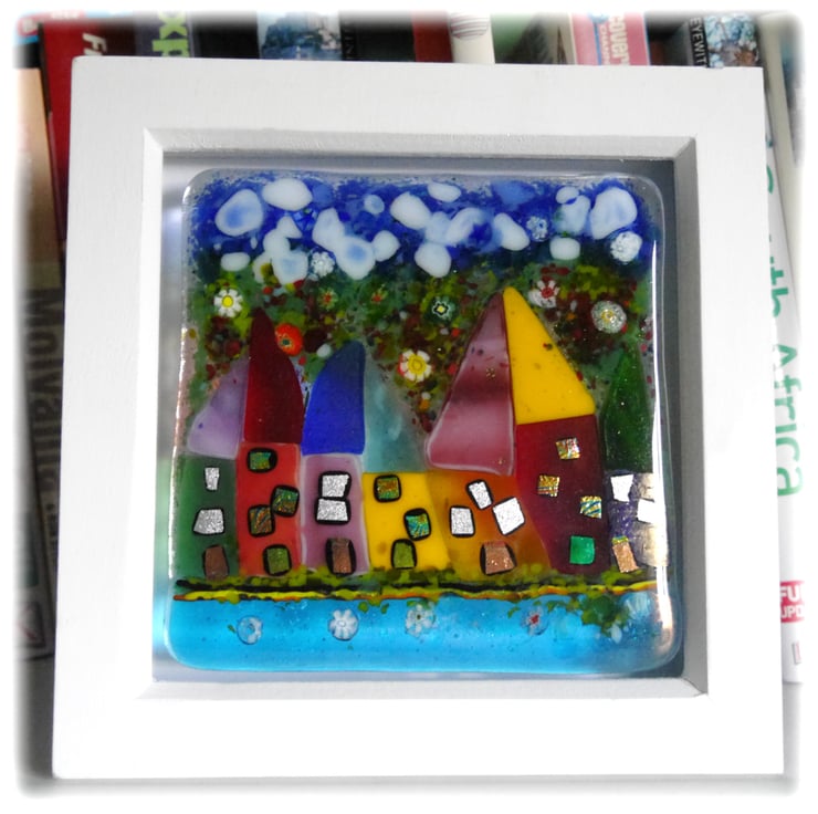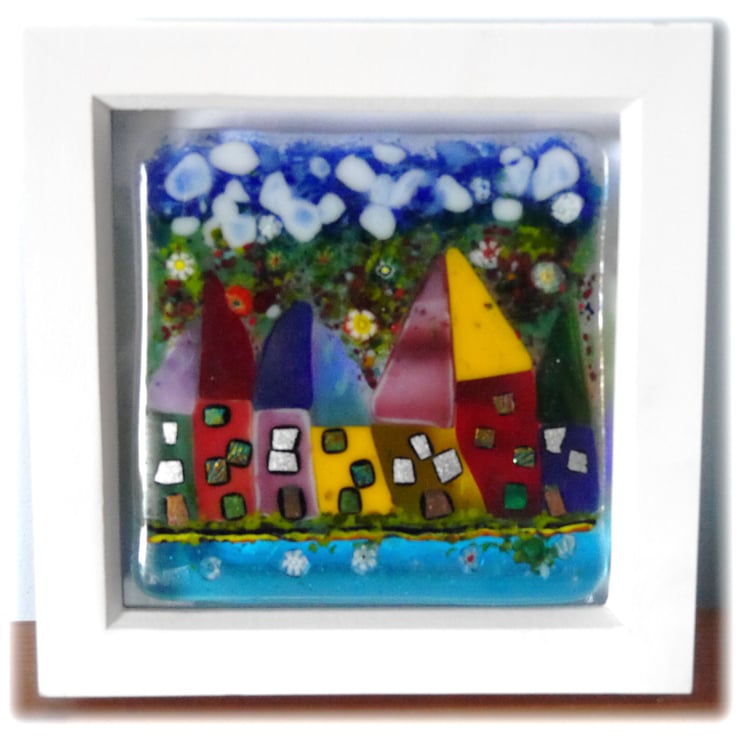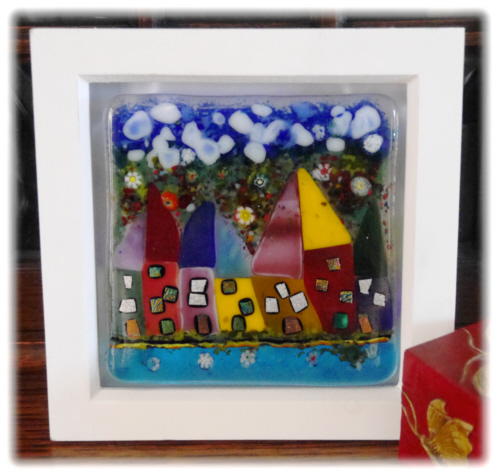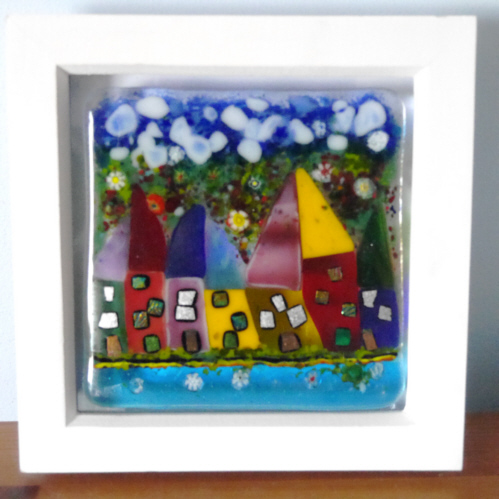 A fused glass picture of a row of 7 little wonky houses. Sitting on the edge of a turquoise lake and surrounded by multicoloured flowers and trees and grass and a blue sky with scudding white clouds.