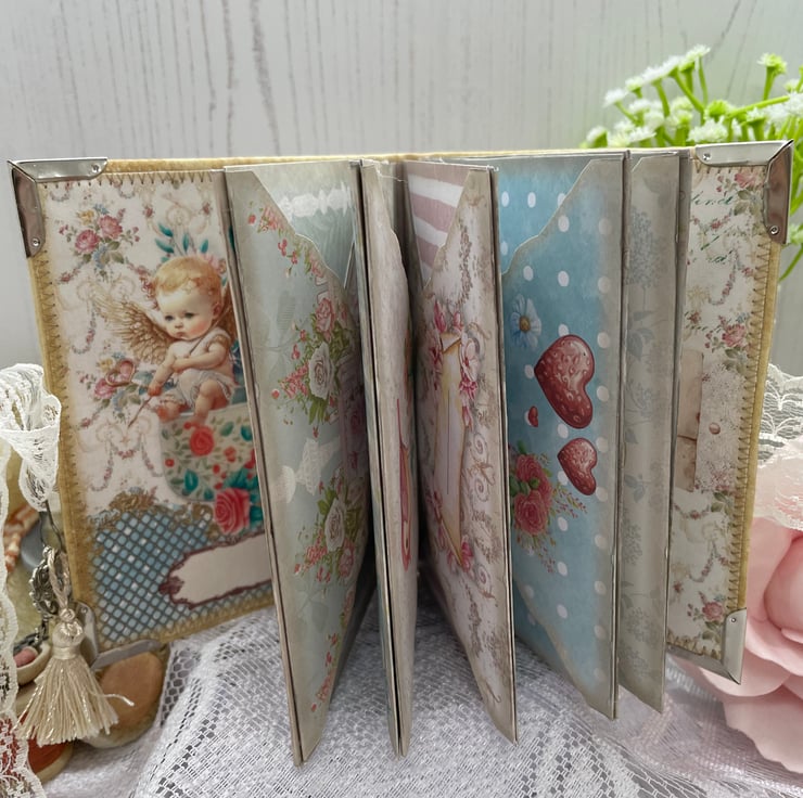 Beautiful handmade envelope love token journal. This small but perfectly formed journal comes with 10 envelopes, placed back to back with an additional pocket in between each 2 envelopes. Each envelope is printed with a stunning design. Machine stitched cover and printed onto cotton fabric, cotton printed panels to inner and back cover. Trimmed with a length of lace for tying, pearls to add detail and organza bows. With silver corner protectors. Charm clip of a silver heart, key and tassel. Store love notes, small gifts and more in the envelopes.