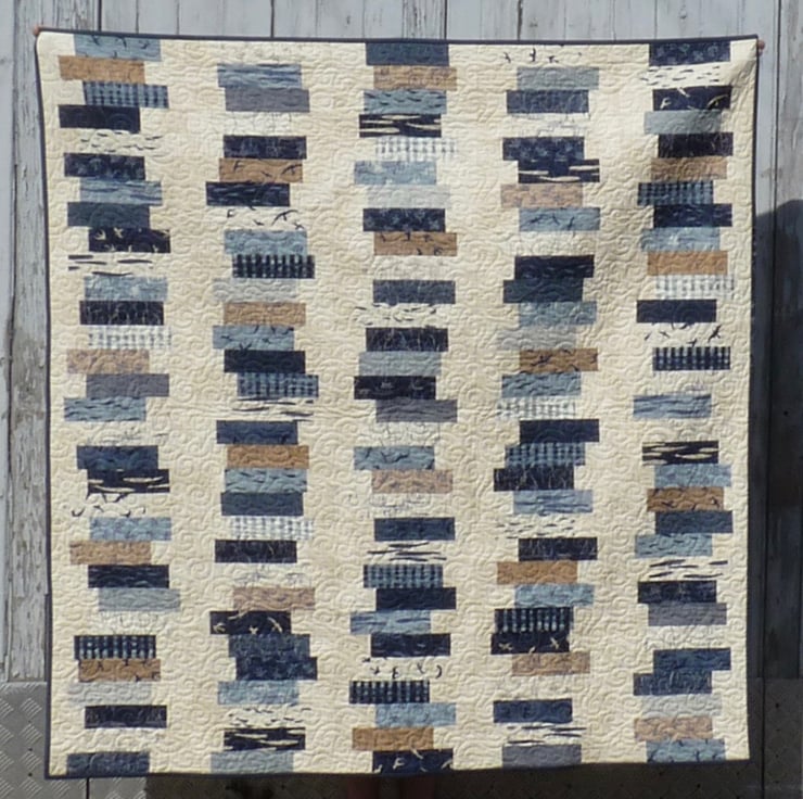 I designed this quilt pattern to represent the drift lines you find on the shore, detailing the ebb and flow of the tide. The quilt pattern is a version of a coin quilt and is constructed using strips of fabric to create wonky fabric coins.