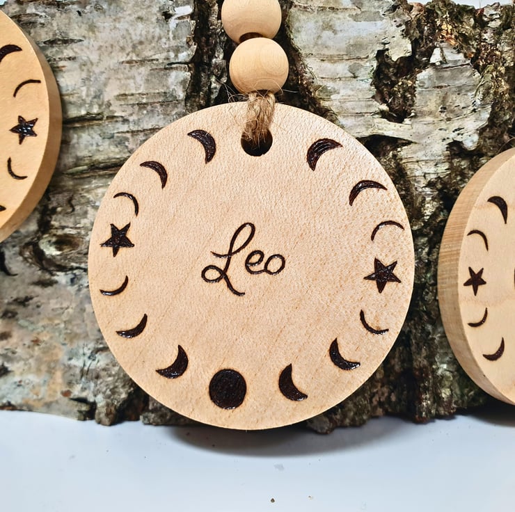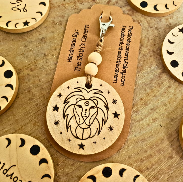 It is round shaped, with a diameter of approximately 6cm (2") and 6mm (1/4 inches thick).It is made from Sycamore wood, light in colour. Both sides are hand drawn with the method of Pyrography (wood burning), one displaying the symbol of the Leo zodiac star sign, while the other shows the word "Leo" surrounded by the moon phases. It connects with the metallic lobster type hook with natural twine, which is decorated with 2 wooden beads. The keyring is approx. 12.5cm long in total.