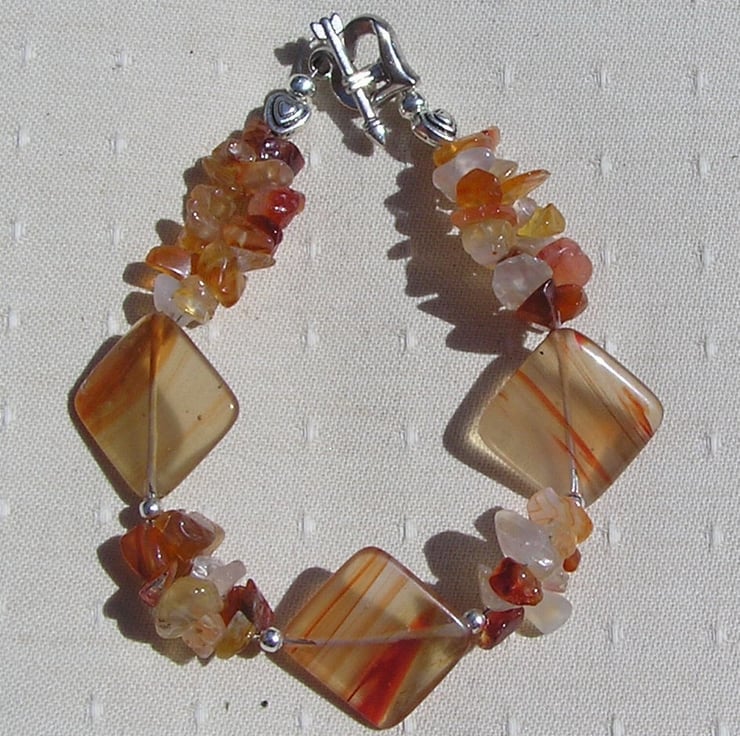 This Stunning Bracelet is made from Red (Orange in colour) Sardonyx - square shaped beads strung at the diagonal separated by double-stranded Carnelian Gem-Chips... a Warming combination that will look stunning either worn casually or with something more Elegant for a Special Evening out