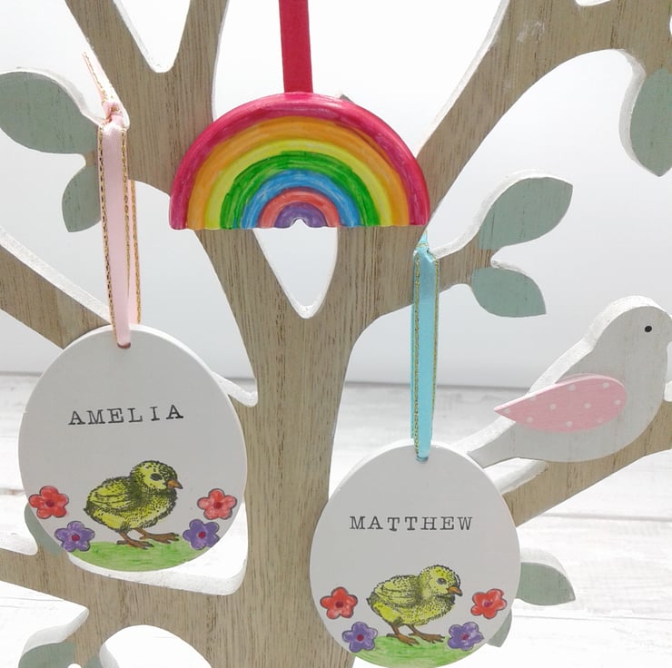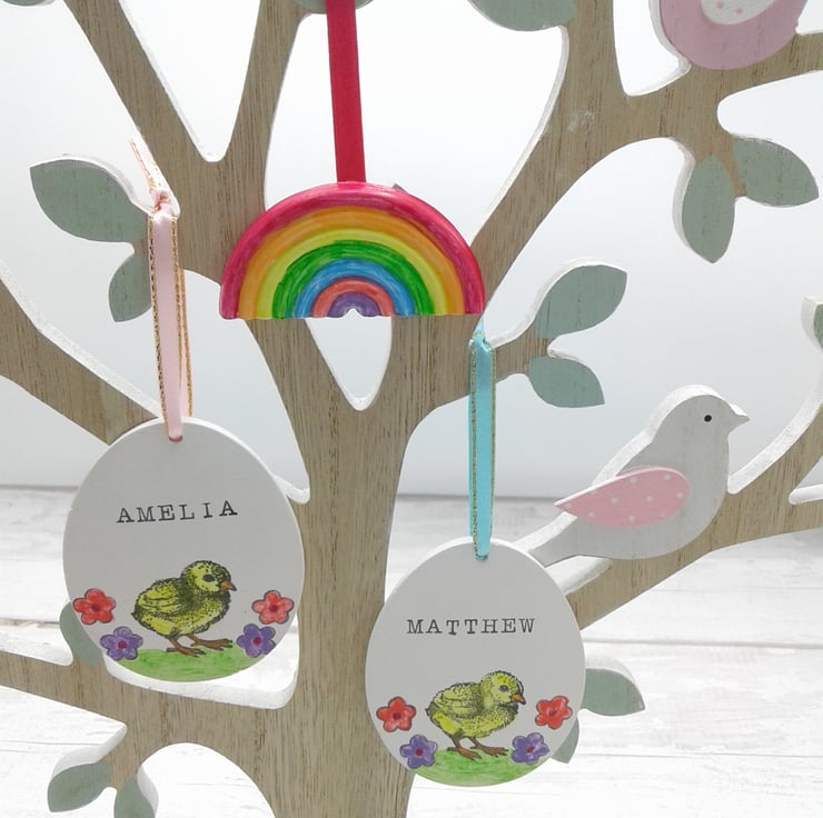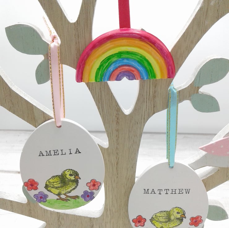 This is a personalised ceramic Easter egg decoration, plus free ceramic rainbow. The ceramic egg is hand painted, wrapped in coordinating tissue paper and presented in a gift box.