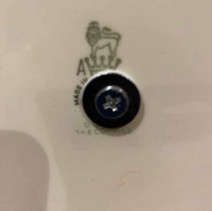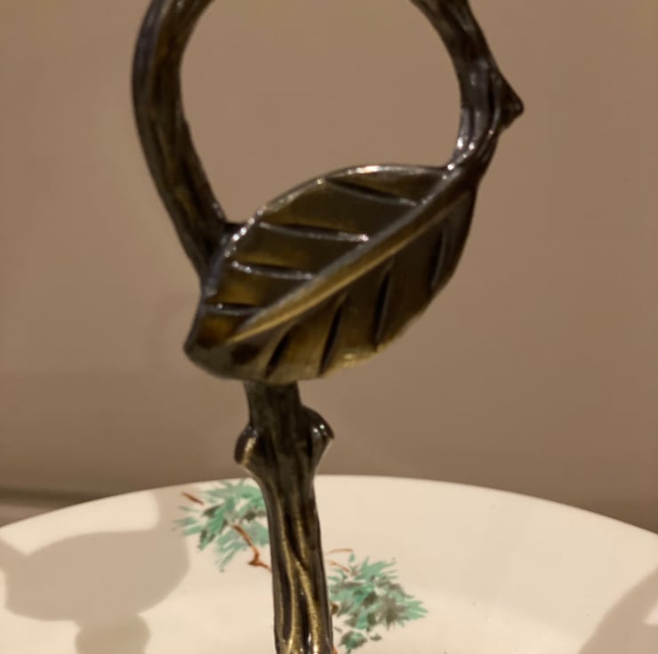 Hello thank you for visiting my shop. This 3 tier cake stand is a great reuse of these English fine country China plates. All put together with a sturdy stylish leaf designed fixings. Send me a message if you would like Antique Gold, Silver or Brushed Nickel.