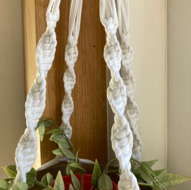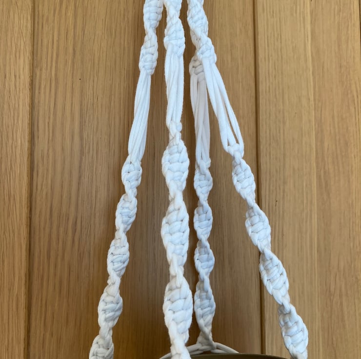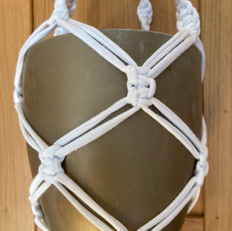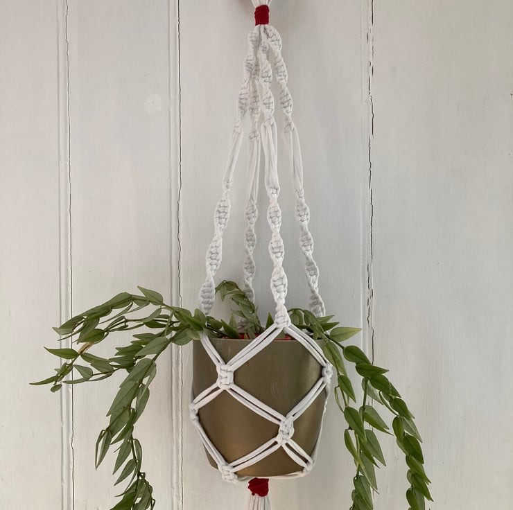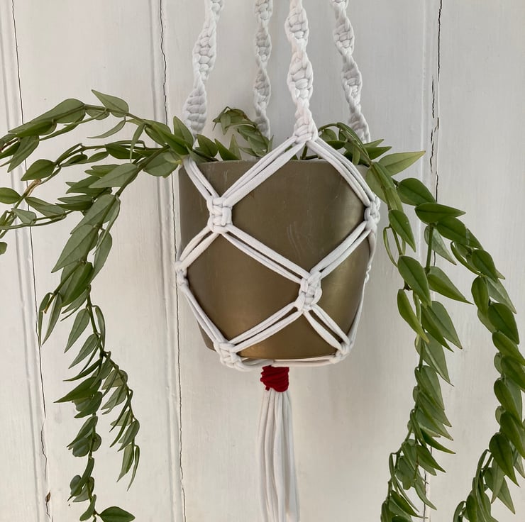 Macrame plant holder made from up-cycled, white tee shirt