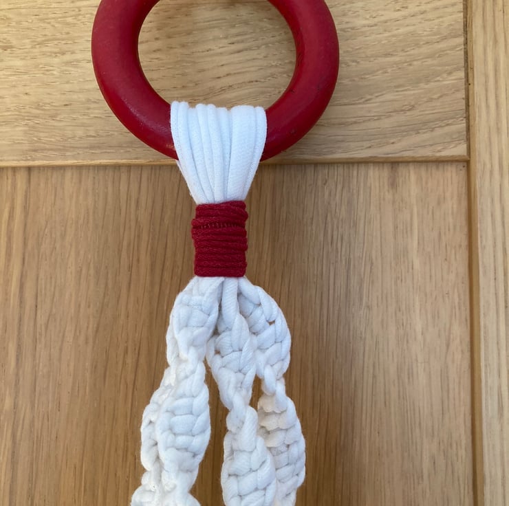 This plant holder has been made using the tee shirt yarn formed from an unloved white, England tee shirt, combined with a ‘surplus to requirement’ red curtain ring. knotting techniques that create a spiral effect have been used and the top and bottom are finished with red tee shirt yarn.