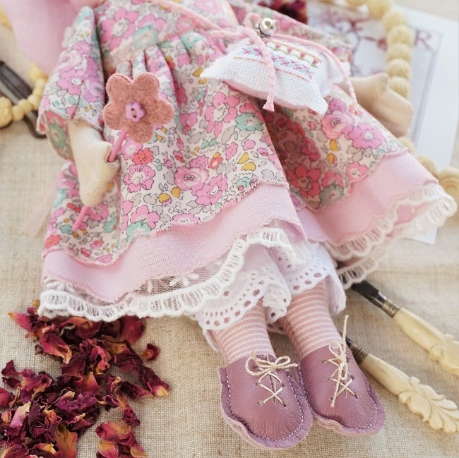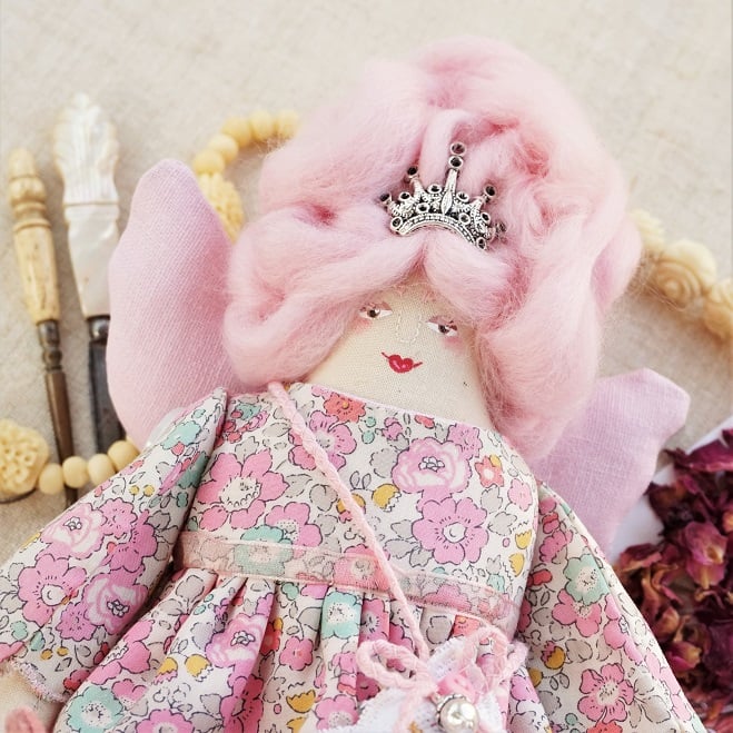 This is Florence. A smaller pattern, she is about two thirds the size of my witch. This little Spring Fairy God Mother has a Liberty print dress in pink with meadow flowers abounding which is called Betsy Ann. She has wings that match her underskirt and sports a little felt flower wand. Her shoes are the smallest I have ever made and are leather. She has a piece of rose quartz to her heart with rose petals in her stuffing and is finished with tiny buttons, organza ribbon and a little coronet in her hair.