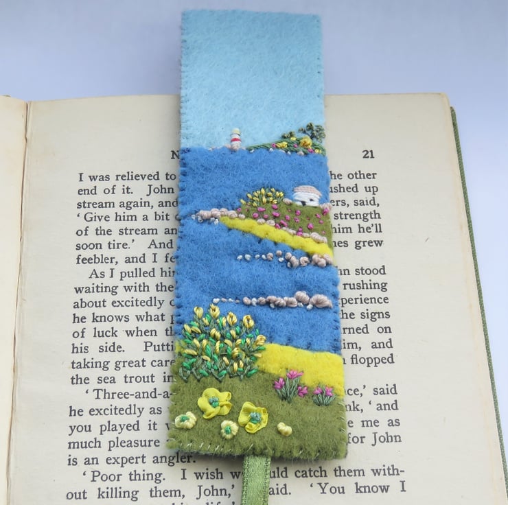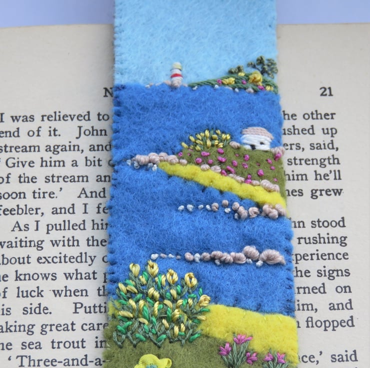 Scraps of green, yellow and blue felt have been appliqued to a background of sky blue felt to produce a 'patchwork' of sea, sand and clifftops. Coastal poppies, gorse, and sea pinks have been embroidered in the foreground using a variety of threads - some of them vintage. More distant details include a tiny lighthouse, a white fisherman's cottage, trees, gorse and rocky outcrops. Silk ribbons have been used to stitch some of the poppies in the foreground.