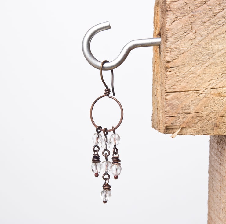 Copper chandelier earrings - copper hoop with clear bead dangle earrings