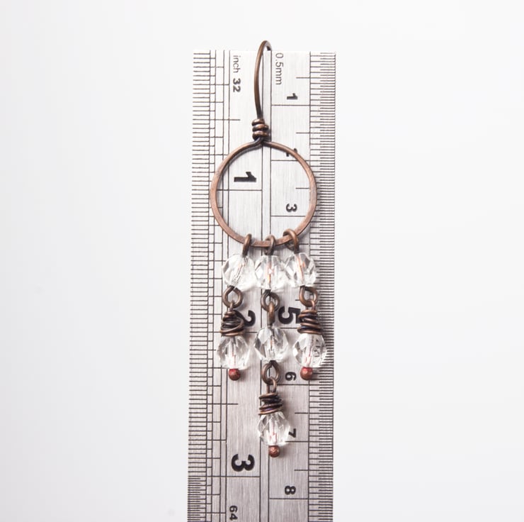 Drops of clear faceted glass are wire wrapped and suspended from copper circles with integrated ear wires. Approximately 7.5cms long including the earwire.