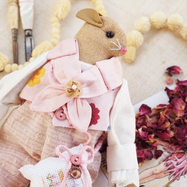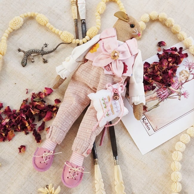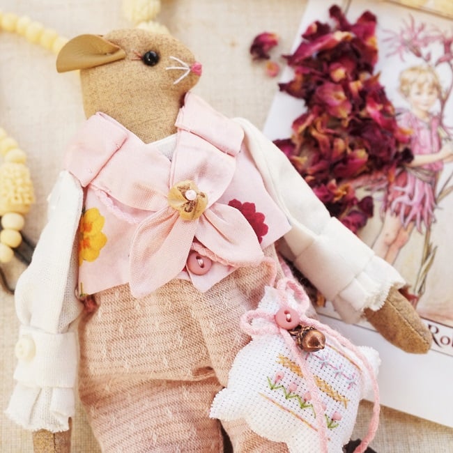 This is Osian, a tiny rose mouse. He is a hand embroidered mouse with little leather ears and tail. He is dressed in tweedy pink yarn dyed cotton plus fours with linen shirt and Liberty Lawn print cotton waistcoat. He is finished with tiny buttons, leather shoes and a sampler on his little bag.