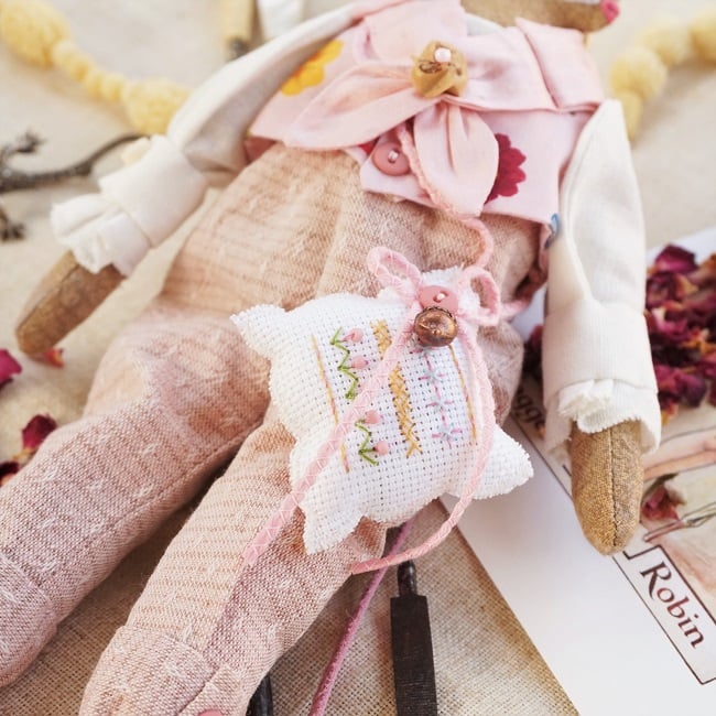 He is softly stuffed with rose petals in his stuffing for a gentle scent and he has a tiny rose quartz crystal at his heart. He has a brass ring to his back in case you want to place him on the wall.
