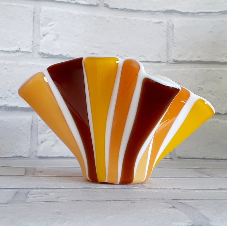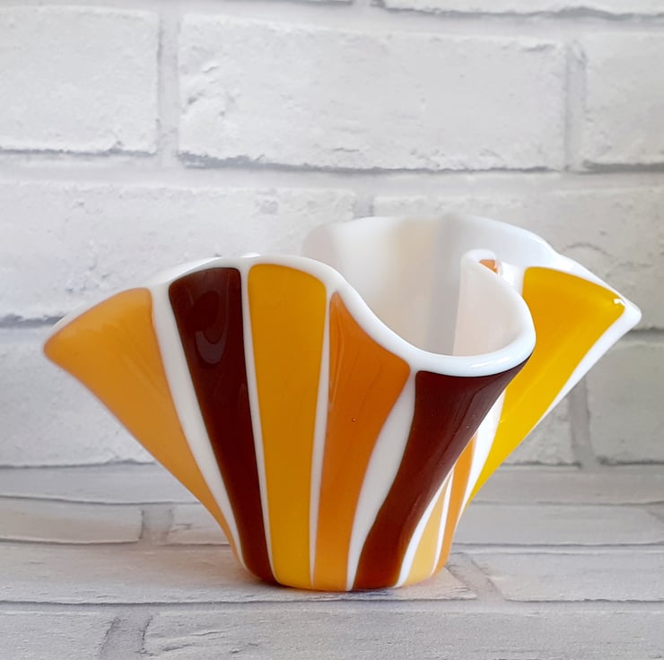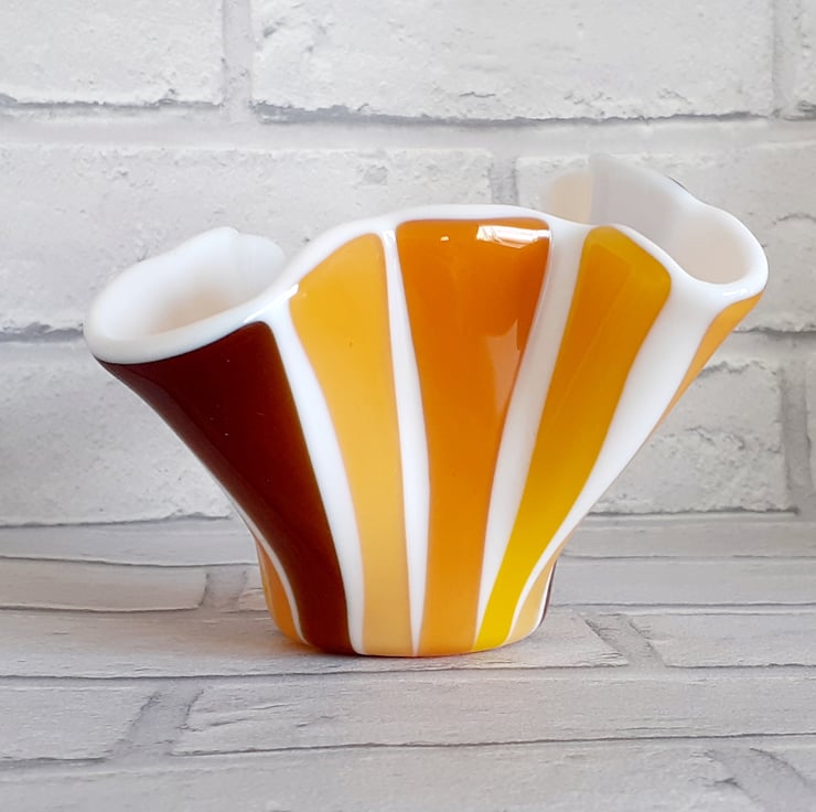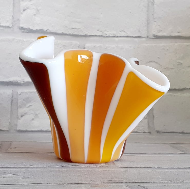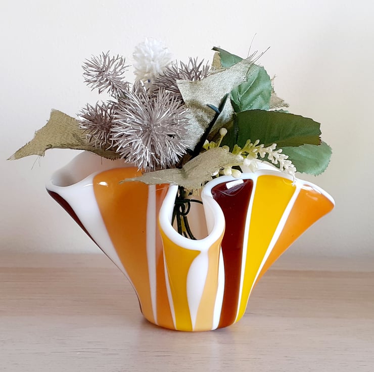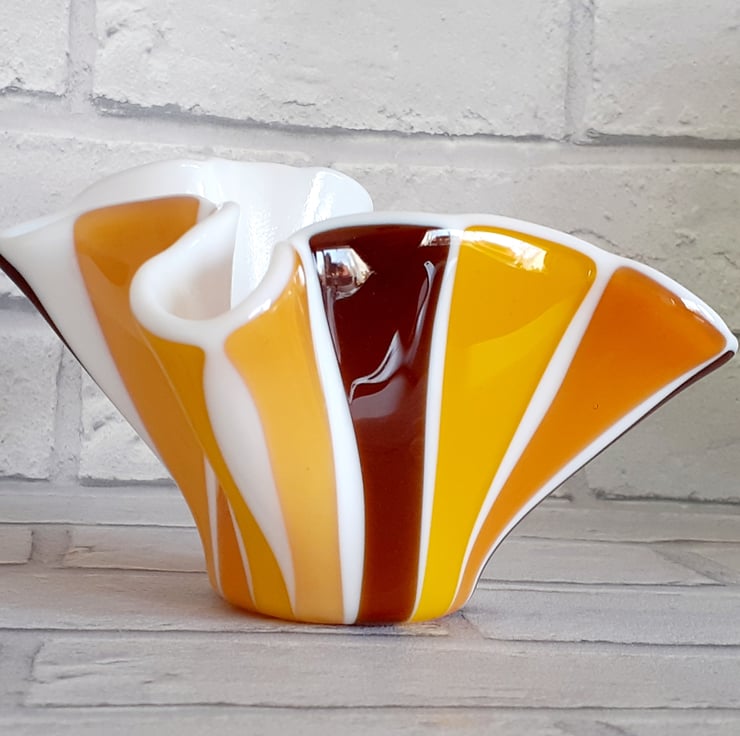 This fused glass ornamental vase was made from art glass in shades of yellow and dark, medium and light amber. The coloured glass was cut and laid out on a white base and kiln-fused together to a smooth finish. The piece was then 'draped' over a mould and fired again at a lower temperature which results in the lovely free-form organic edges. The vase looks different depending on which side it is viewed from.