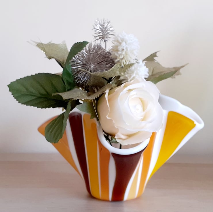 This one of a kind vase could be filled with fresh or dried flowers, perhaps using a block of oasis or a small plastic bottle as a liner. Alternatively, fill with sweets or potpourri or display as a stand alone display piece.