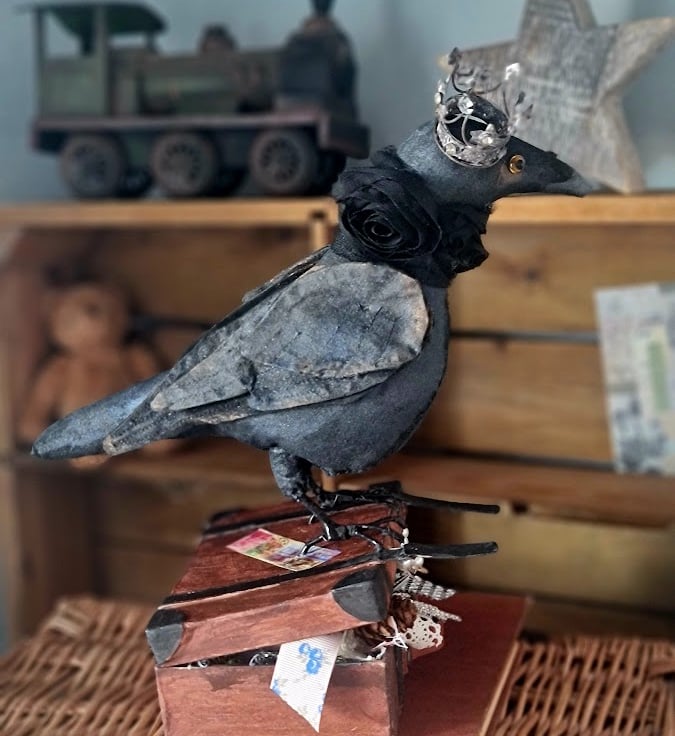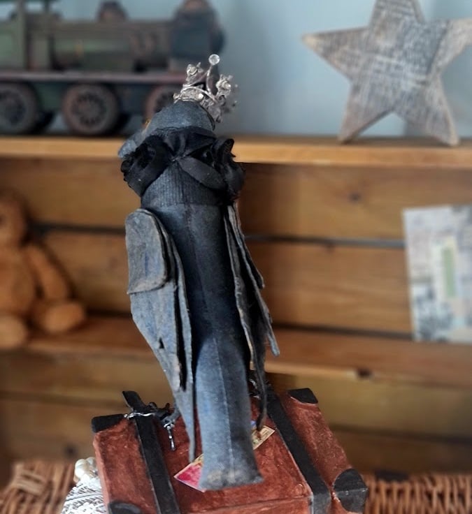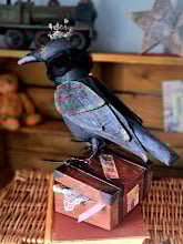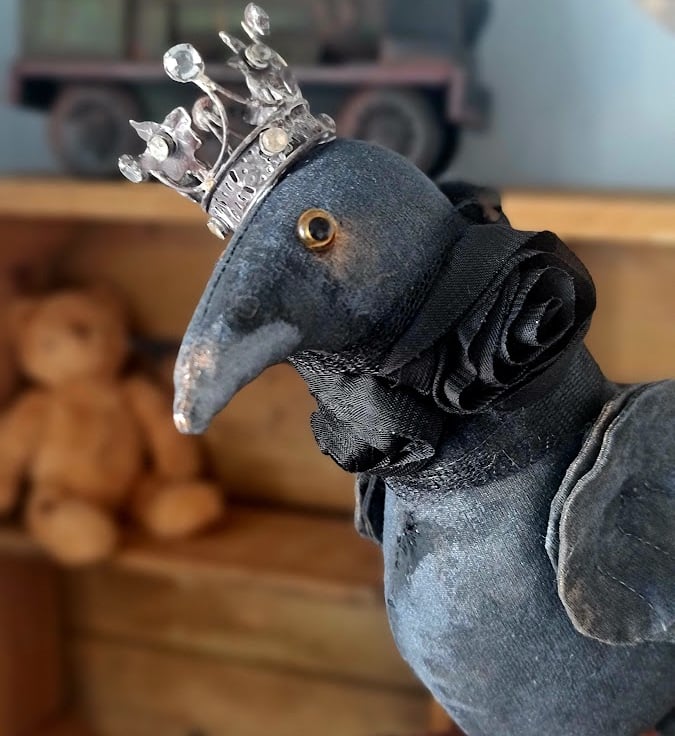 Raven is hand and machine stiched as well as hand painted to make him shimmer. Upon his head is a little metal crown with jewel embellishments and his neck is adorned with black fabric roses on net.